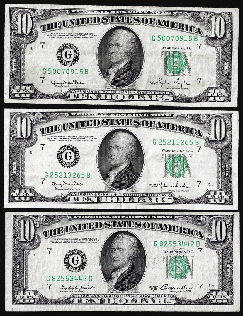 One Lot of (3) 1950 $10 Federal Reserve Notes Chicago.