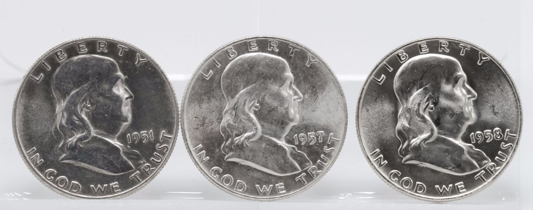 One Lot of (3) 1951, 1957, 1958 Franklin Half Dollars.