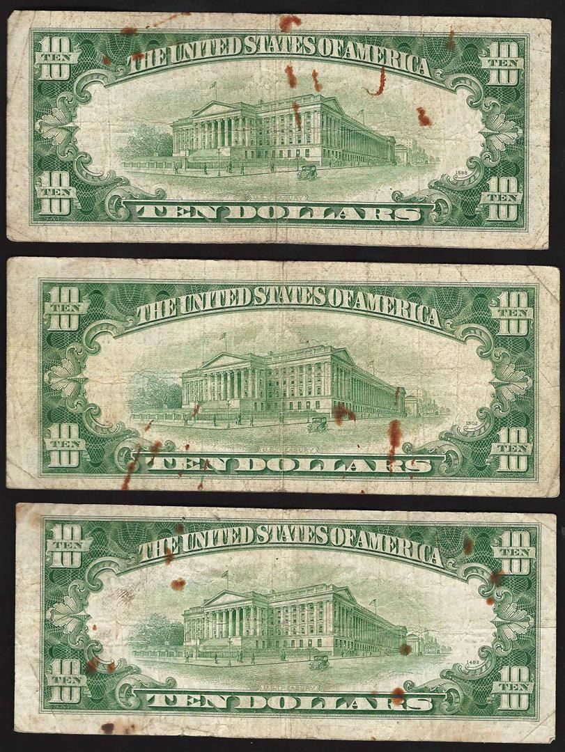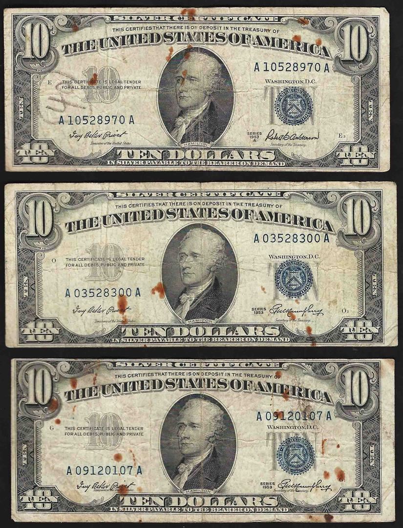 One Lot of (3) 1953 $10 Silver Certificate Notes.