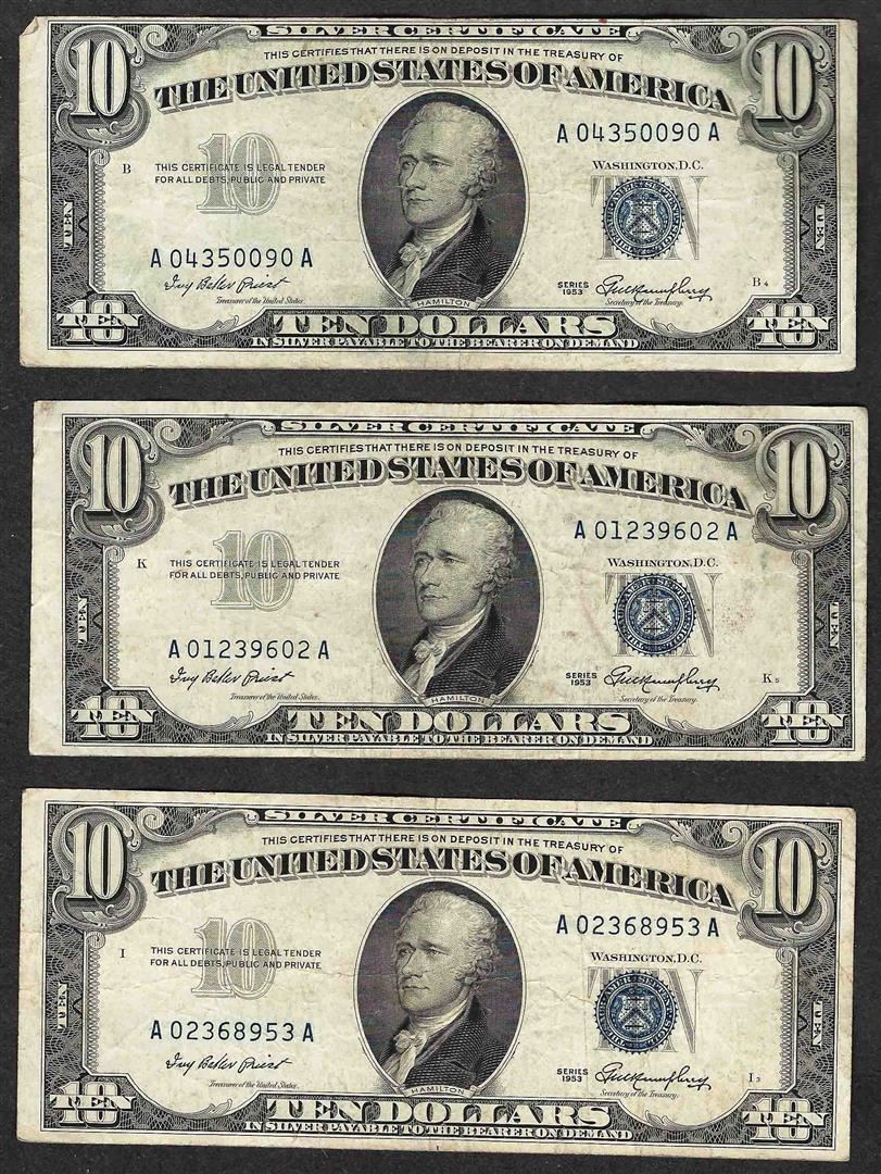 One Lot of (3) 1953 $10 Silver Certificate Notes.