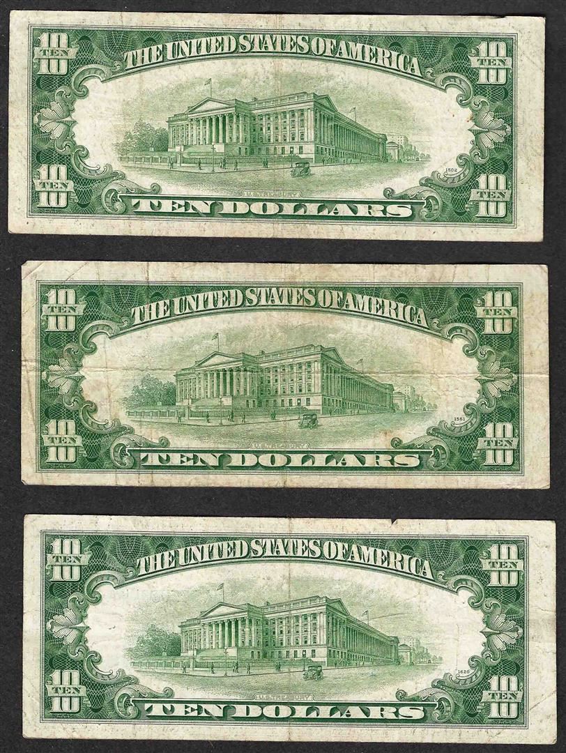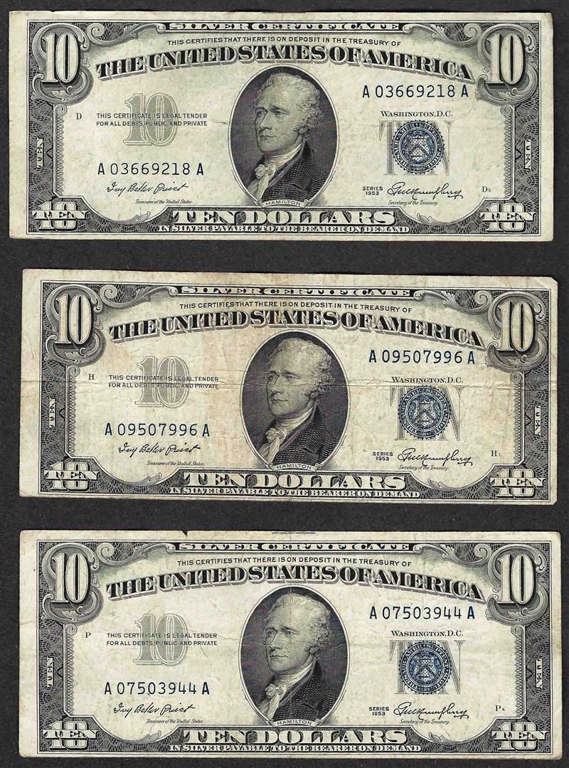One Lot of (3) 1953 $10 Silver Certificate Notes.