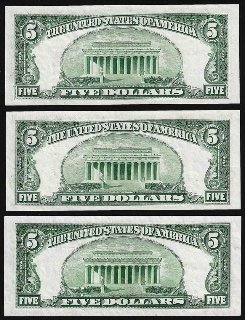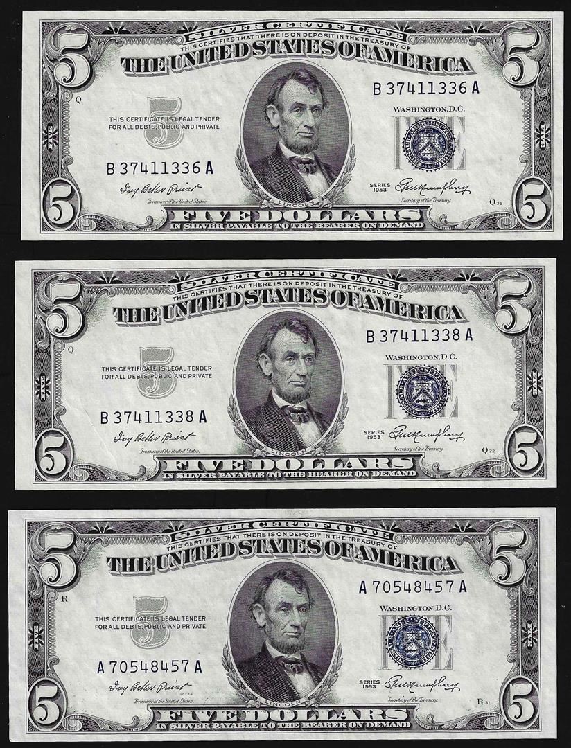 One Lot of (3) 1953 $5 Silver Certificate Notes Choice Uncirculated.