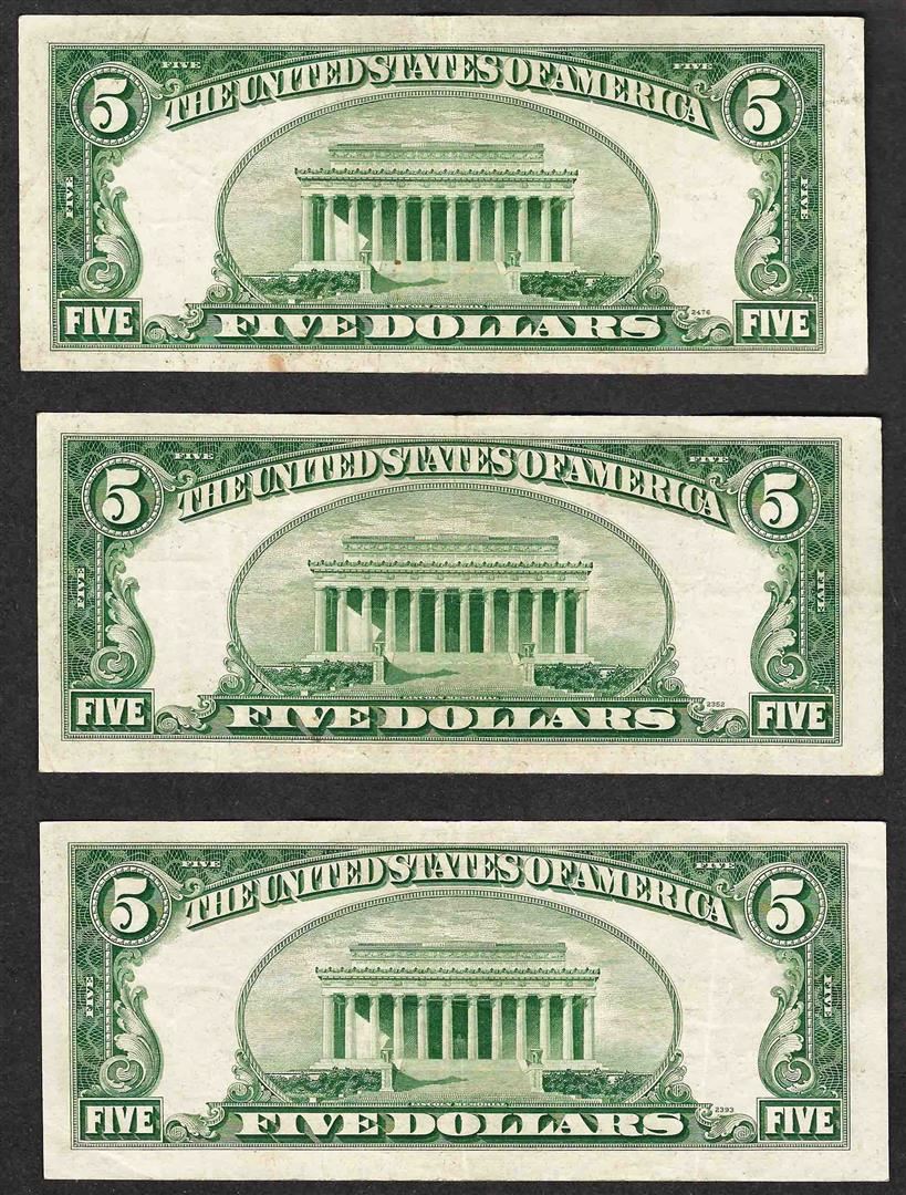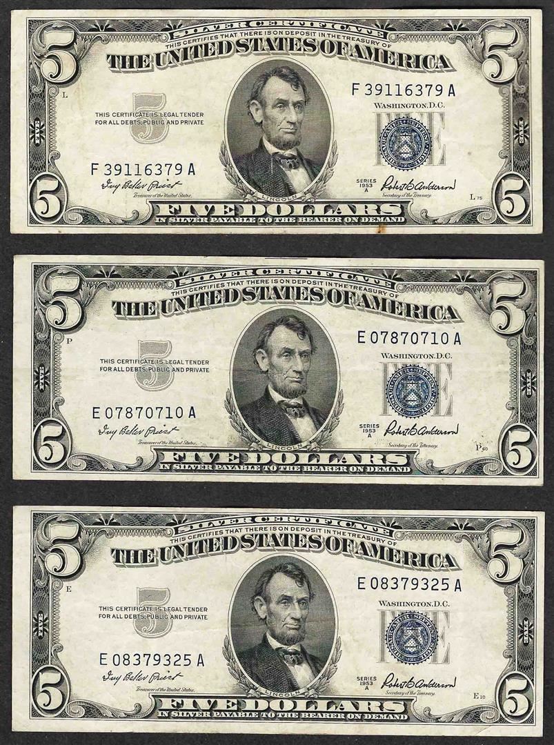 One Lot of (3) 1953A $5 Silver Certificate Notes.