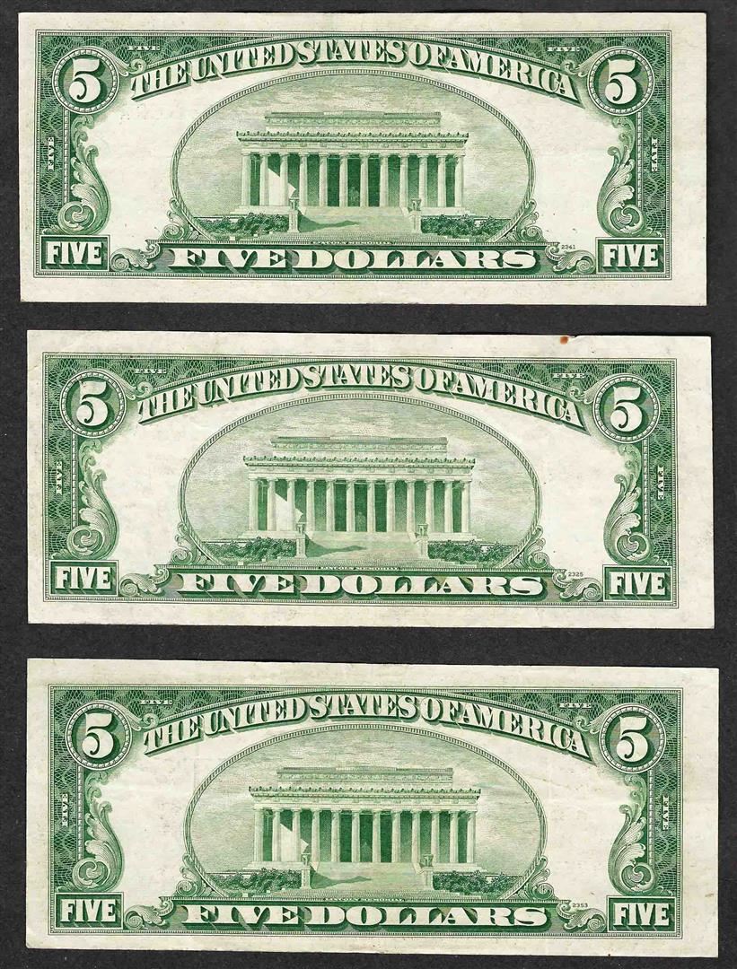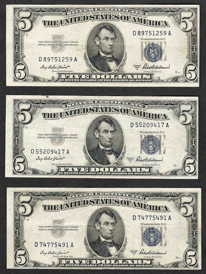 One Lot of (3) 1953A $5 Silver Certificate Notes.
