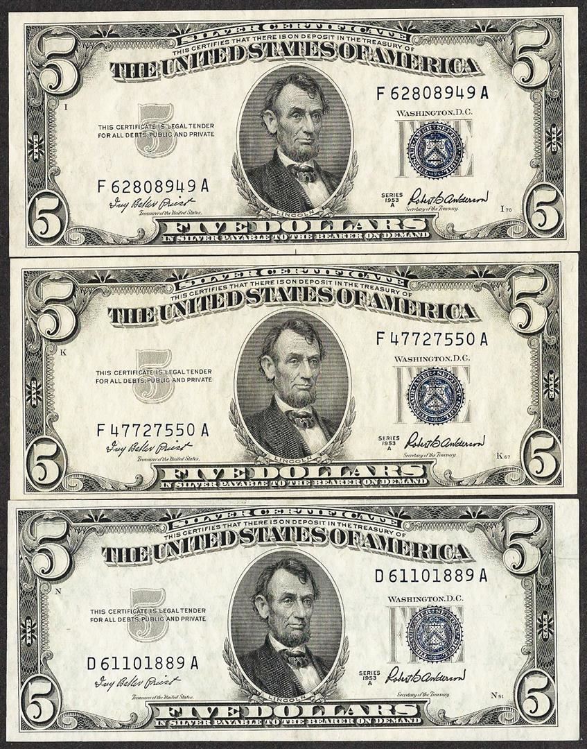 One Lot of (3) 1953A $5 Silver Certificate Notes.