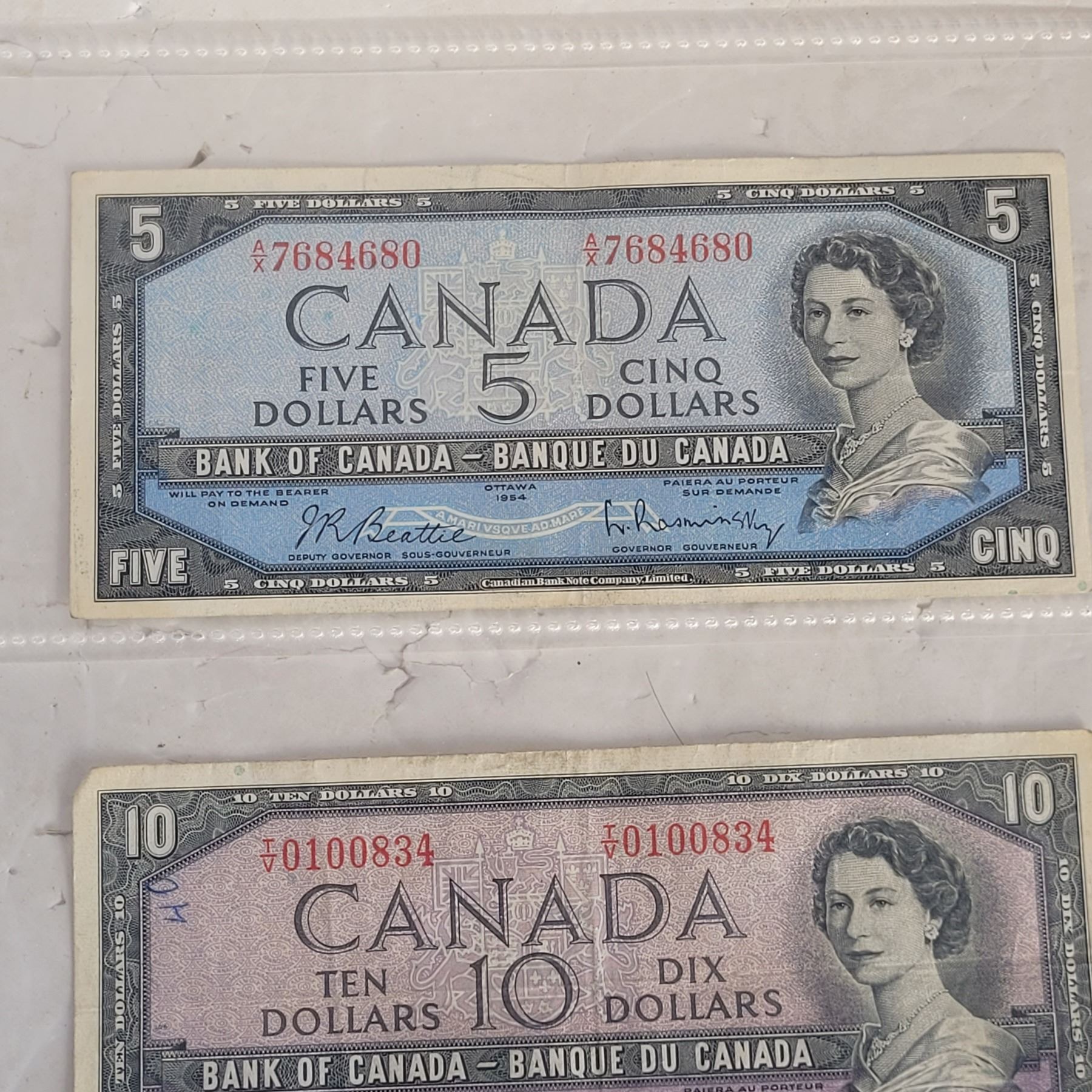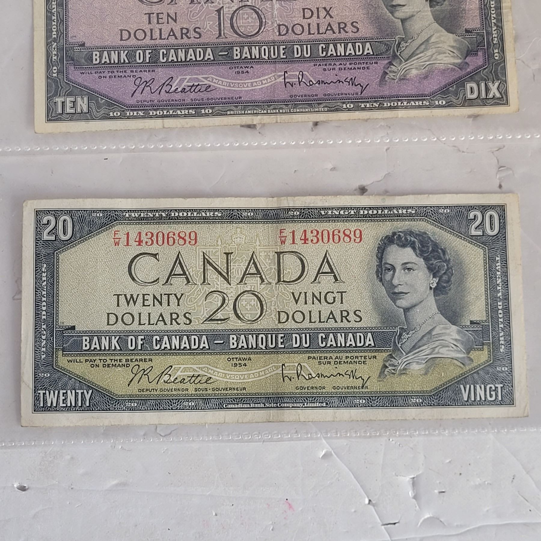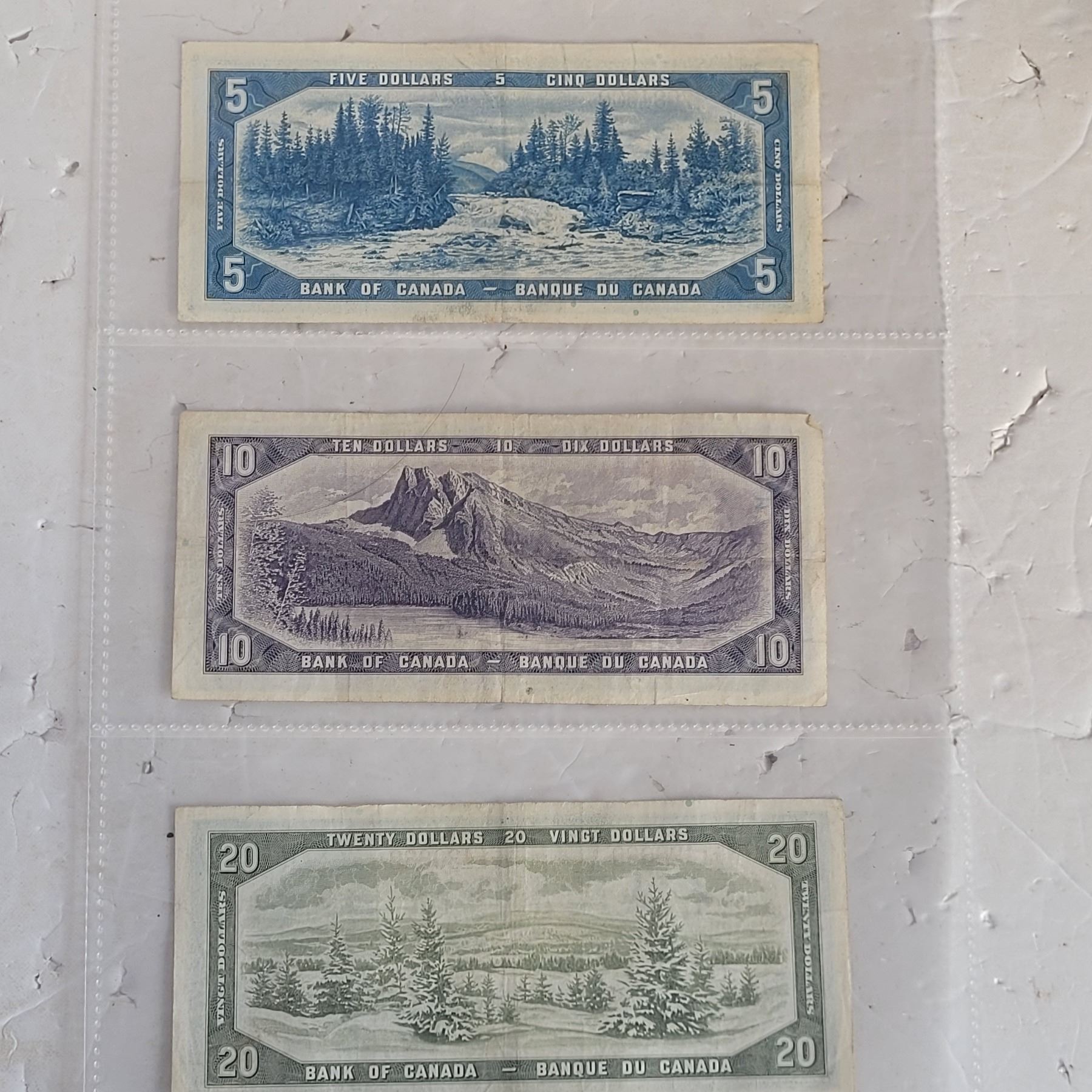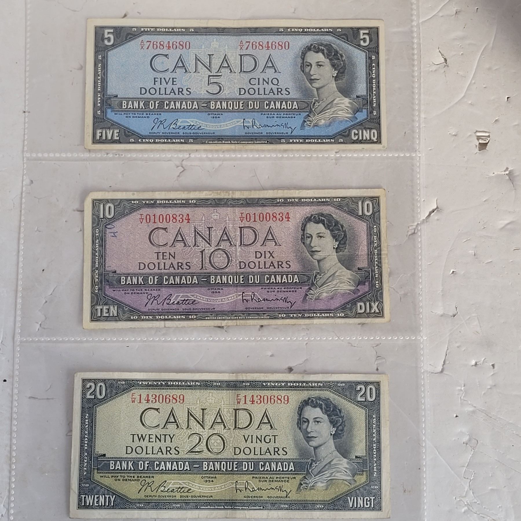 Lot of 3 1954 Bank of Canada Banknotes - $5 $10 $20