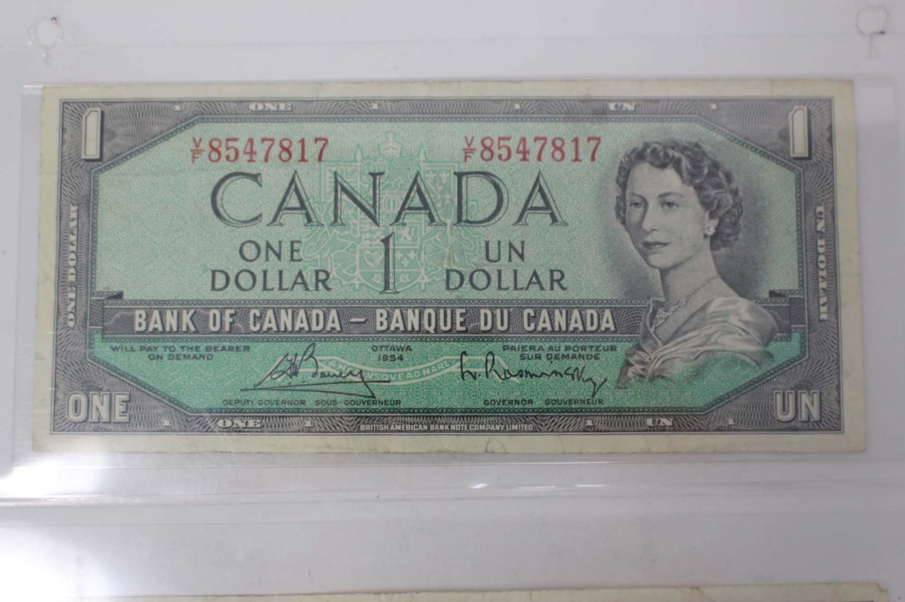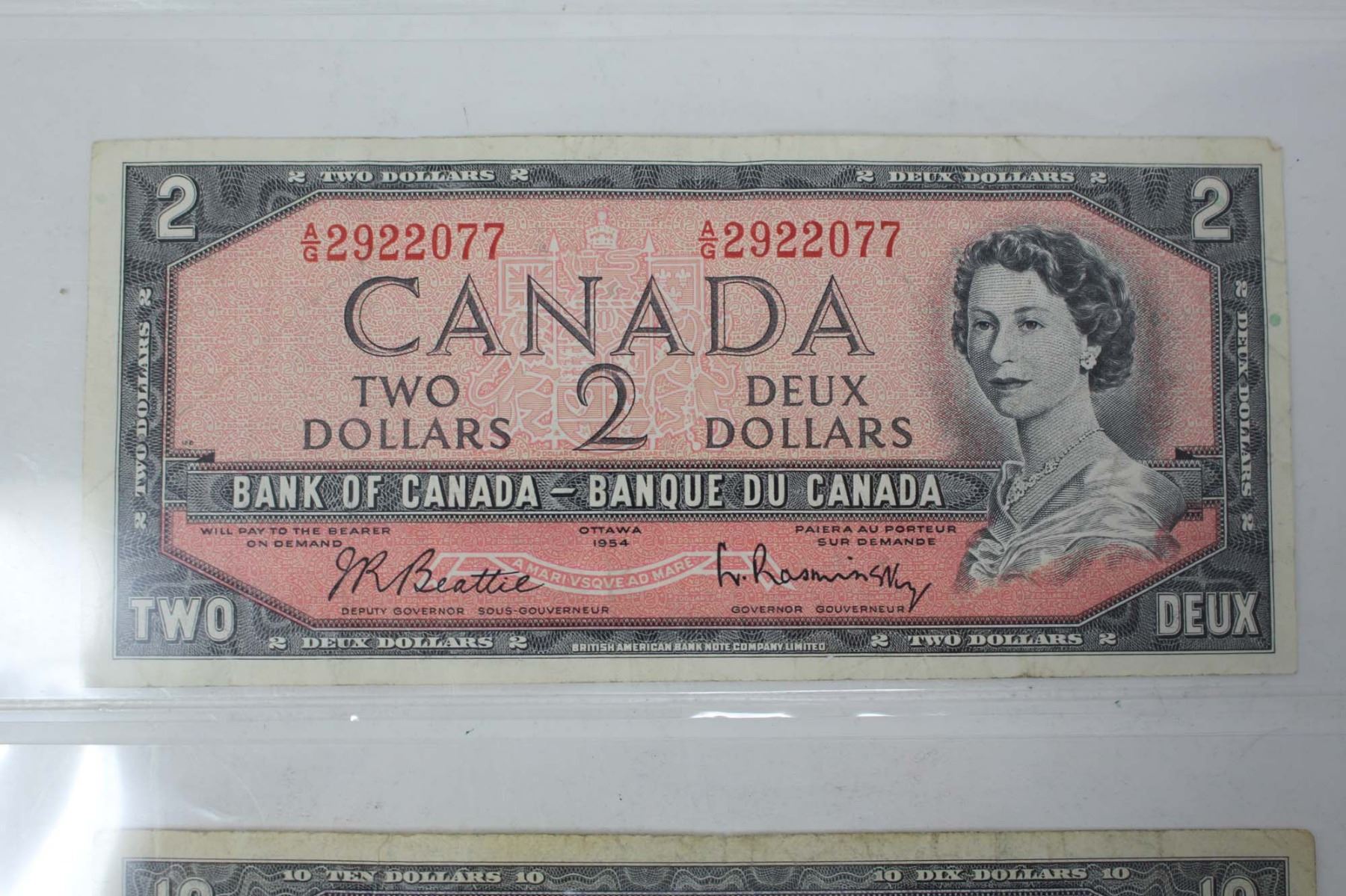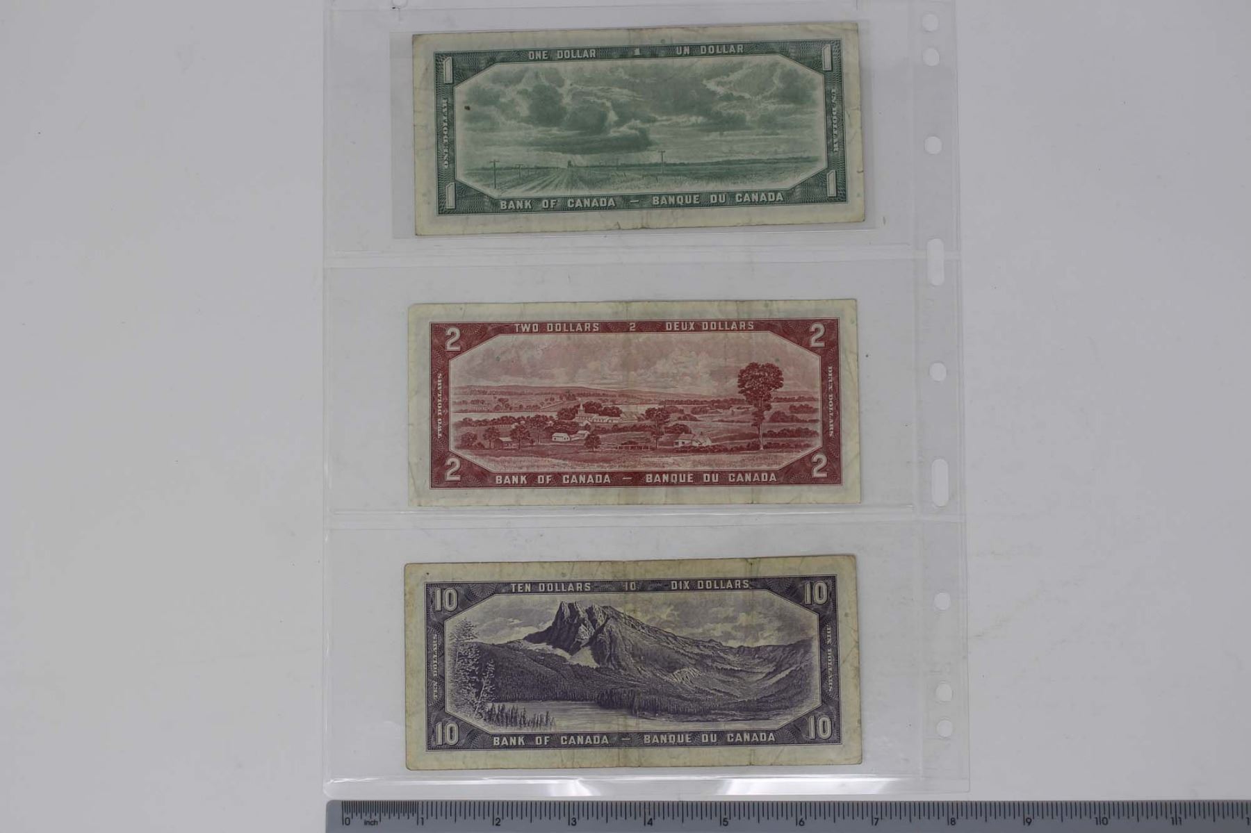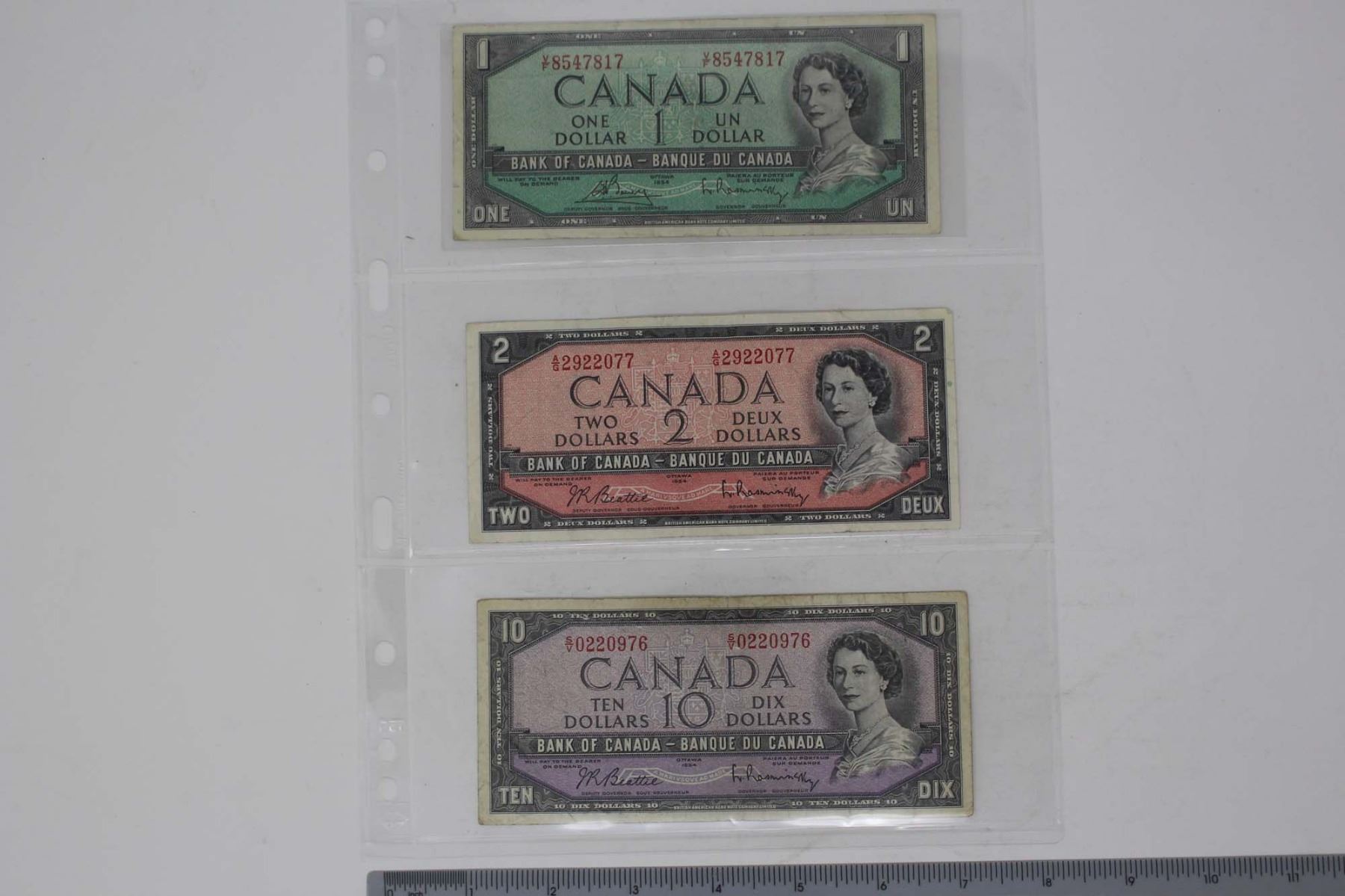 Lot of 3 1954 Canadian 1, 2, 10 Dollar Bank Notes
