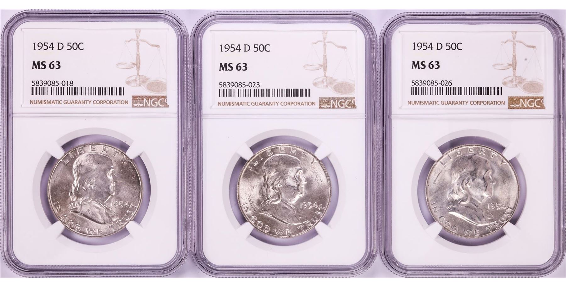 One Lot of (3) 1954-D Franklin Half Dollar Coins NGC MS63. NGC Certified.