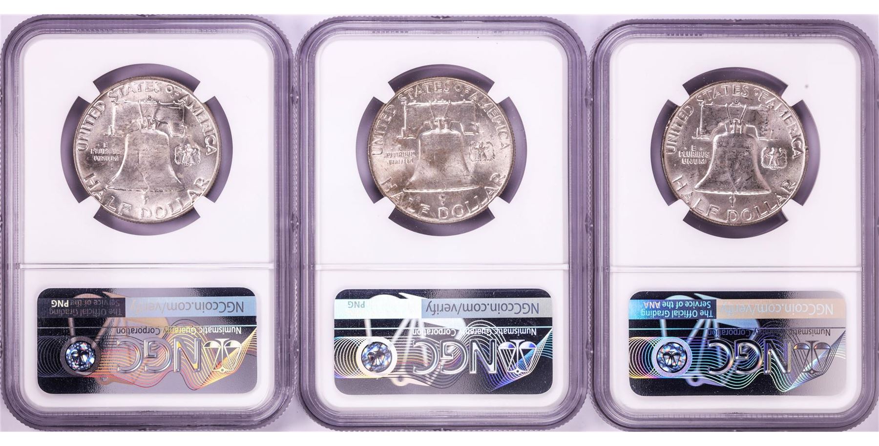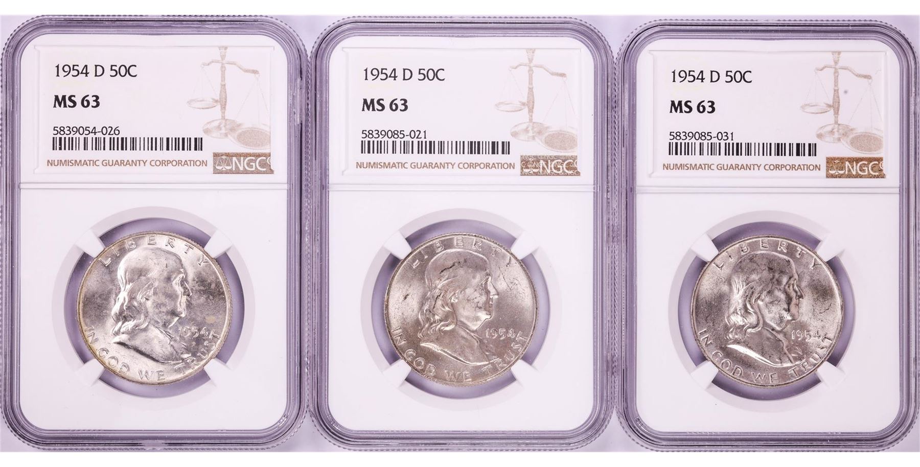 One Lot of (3) 1954-D Franklin Half Dollar Coins NGC MS63. NGC Certified.