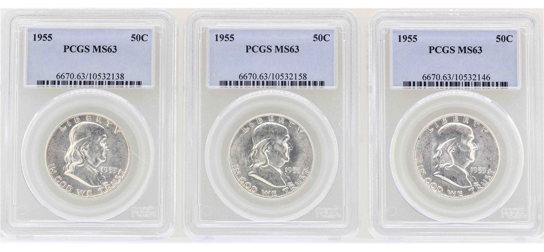 One Lot of (3) 1955 Franklin Half Dollar Coins NGC MS63. NGC Certified.