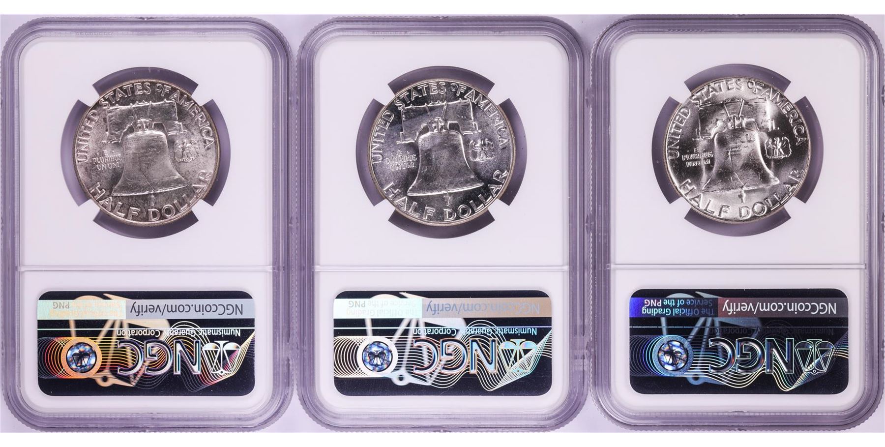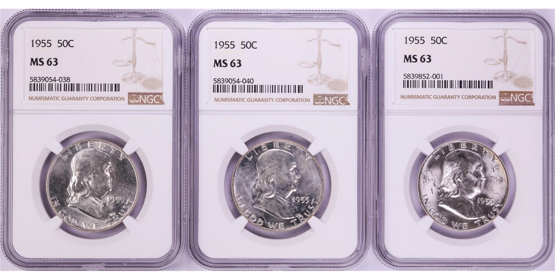 One Lot of (3) 1955 Franklin Half Dollar Coins NGC MS63. NGC Certified.