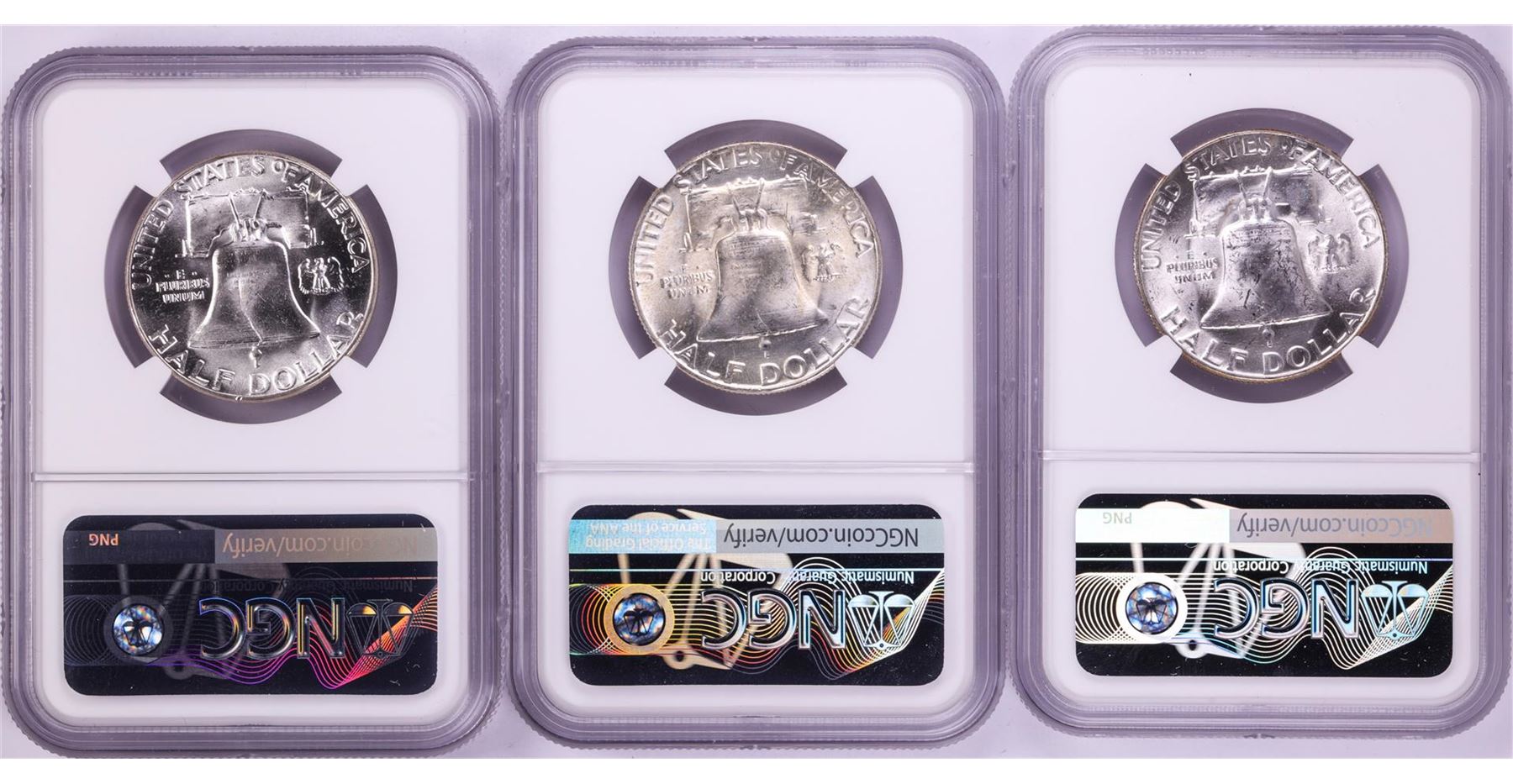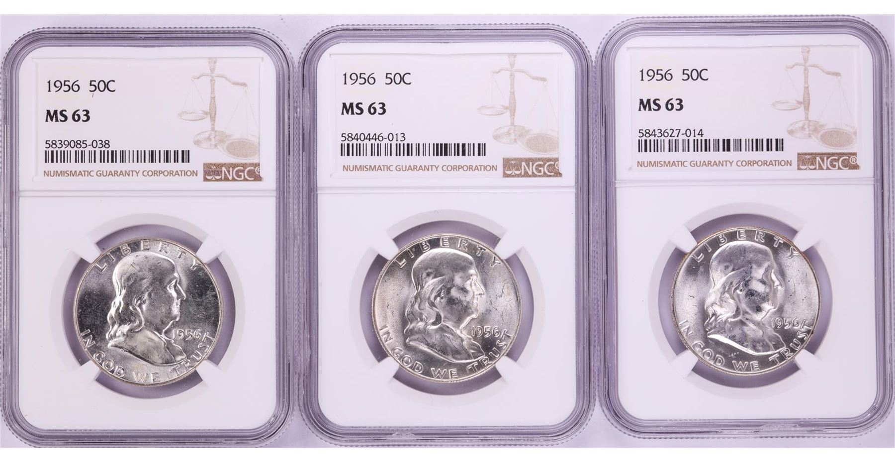 One Lot of (3) 1956 Franklin Half Dollar Coins NGC MS63. NGC Certified.