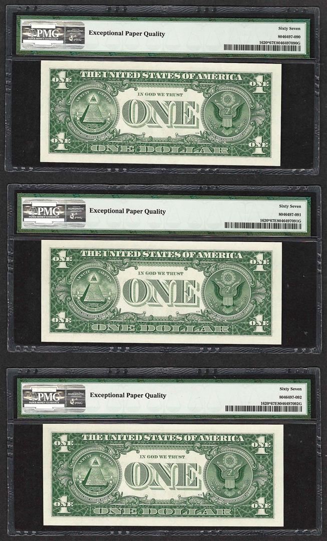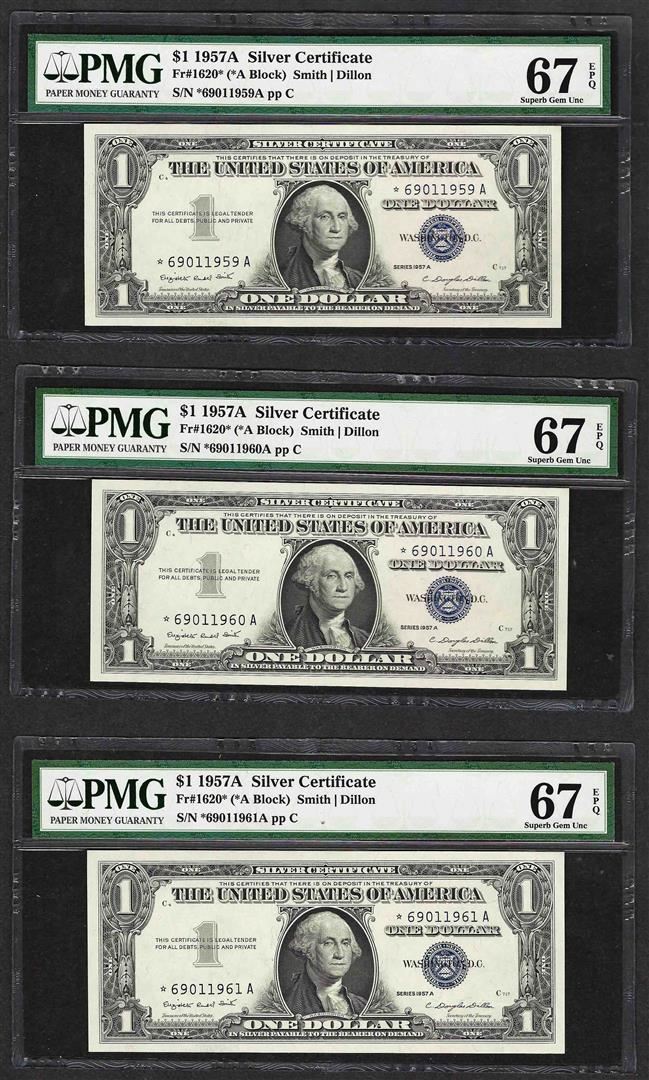 One Lot of (3) 1957A $1 Silver Certificate STAR Notes PMG Superb Gem Uncirculated 67EPQ. PMG Certified.
