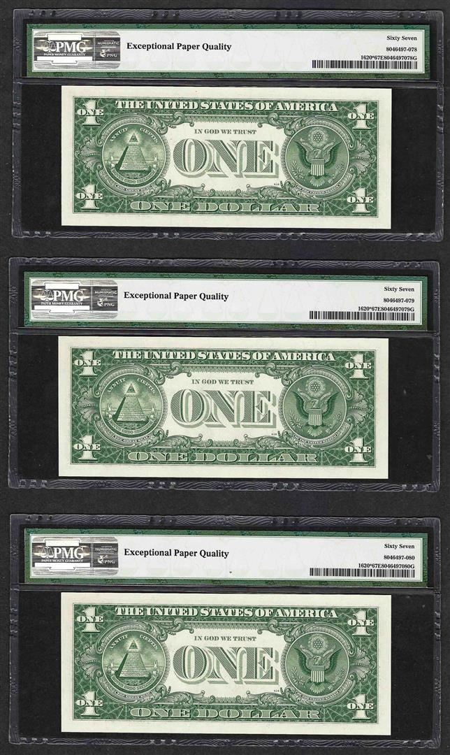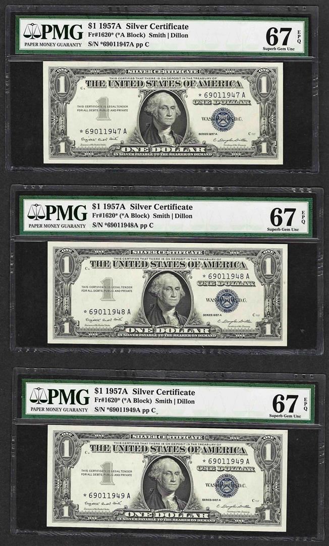 One Lot of (3) 1957A $1 Silver Certificate STAR Notes PMG Superb Gem Uncirculated 67EPQ. PMG Certified.