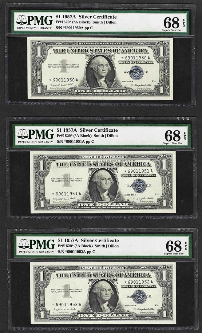 One Lot of (3) 1957A $1 Silver Certificate STAR Notes PMG Superb Gem Uncirculated 68EPQ. PMG Certified.