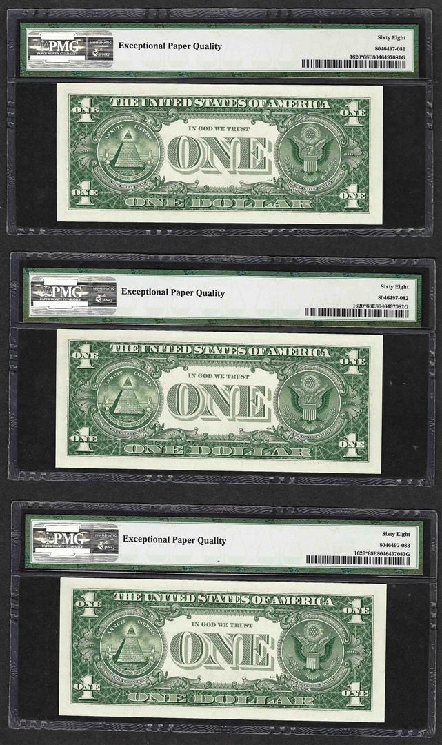 One Lot of (3) 1957A $1 Silver Certificate STAR Notes PMG Superb Gem Uncirculated 68EPQ. PMG Certified.