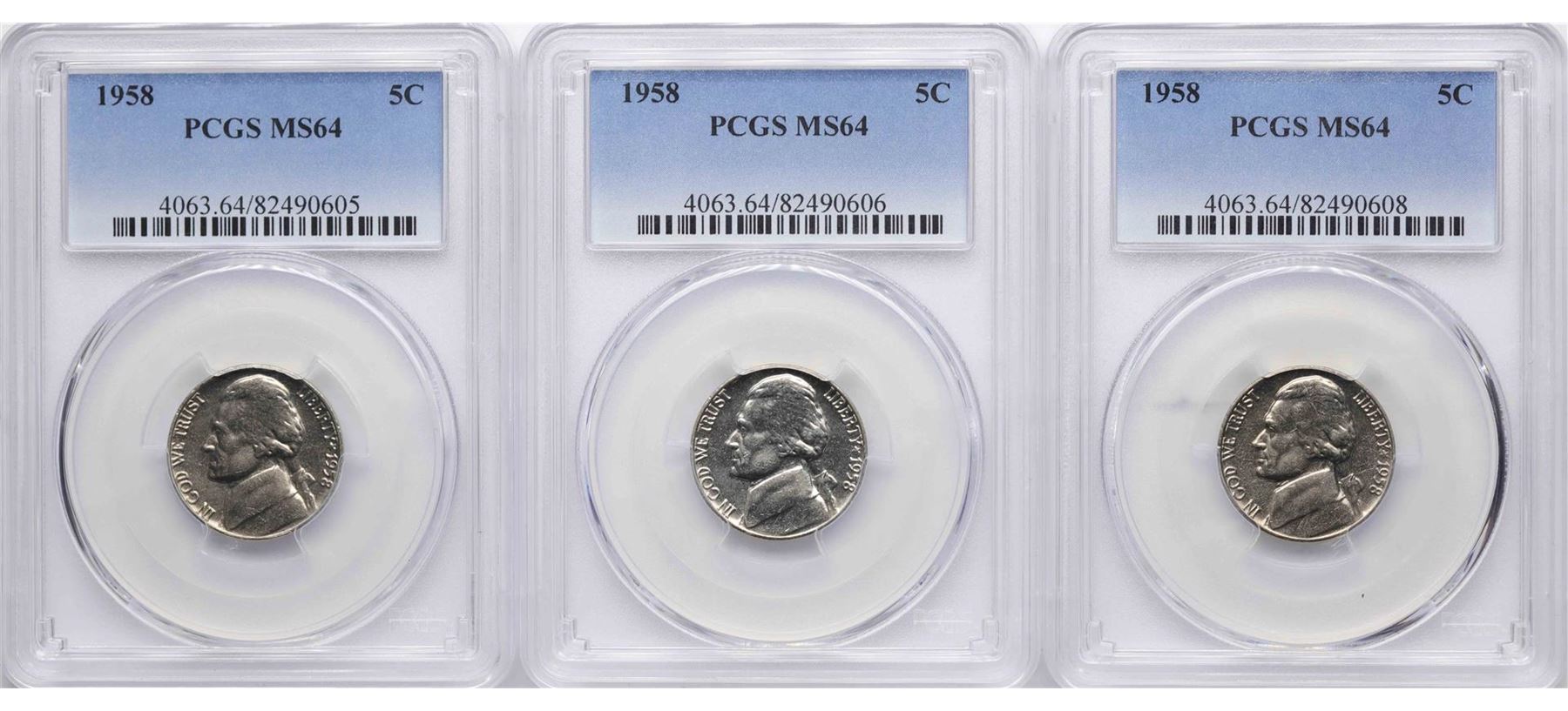 One Lot of (3) 1958 Jefferson Nickel Coins PCGS MS64. PCGS Graded.