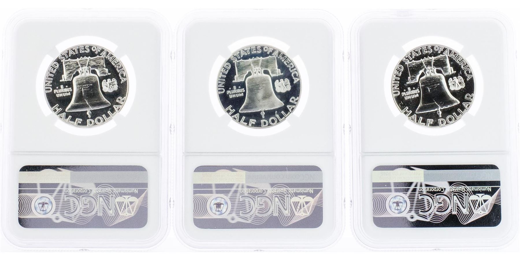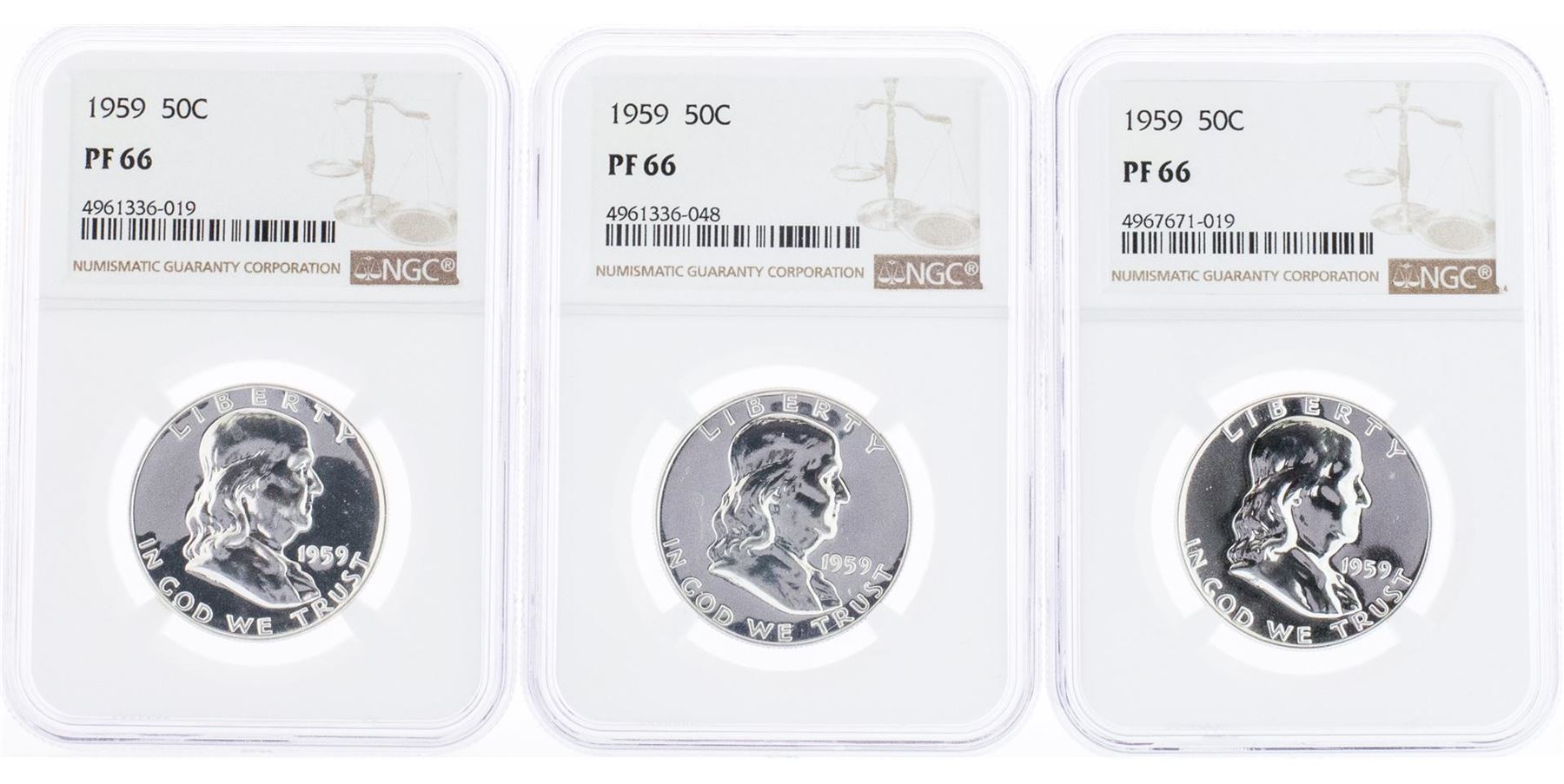 One Lot of (3) 1959 Proof Franklin Half Dollar Coins NGC PF66. NGC Certified.