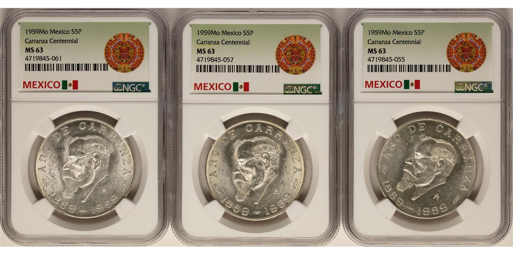 One Lot of (3) 1959Mo Mexico 5 Pesos Carranza Centennial Silver Coins NGC MS63. NGC Certified.