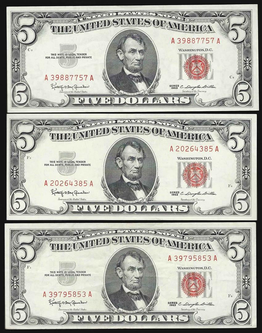 One Lot of (3) 1963 $5 Legal Tender Notes.