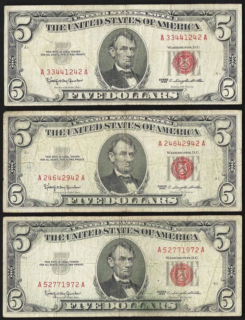 One Lot of (3) 1963 $5 Legal Tender Notes.