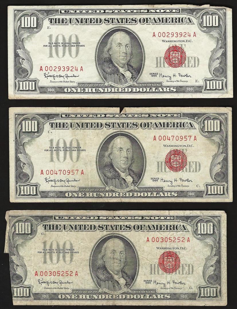 One Lot of (3) 1966 $100 Legal Tender Notes.