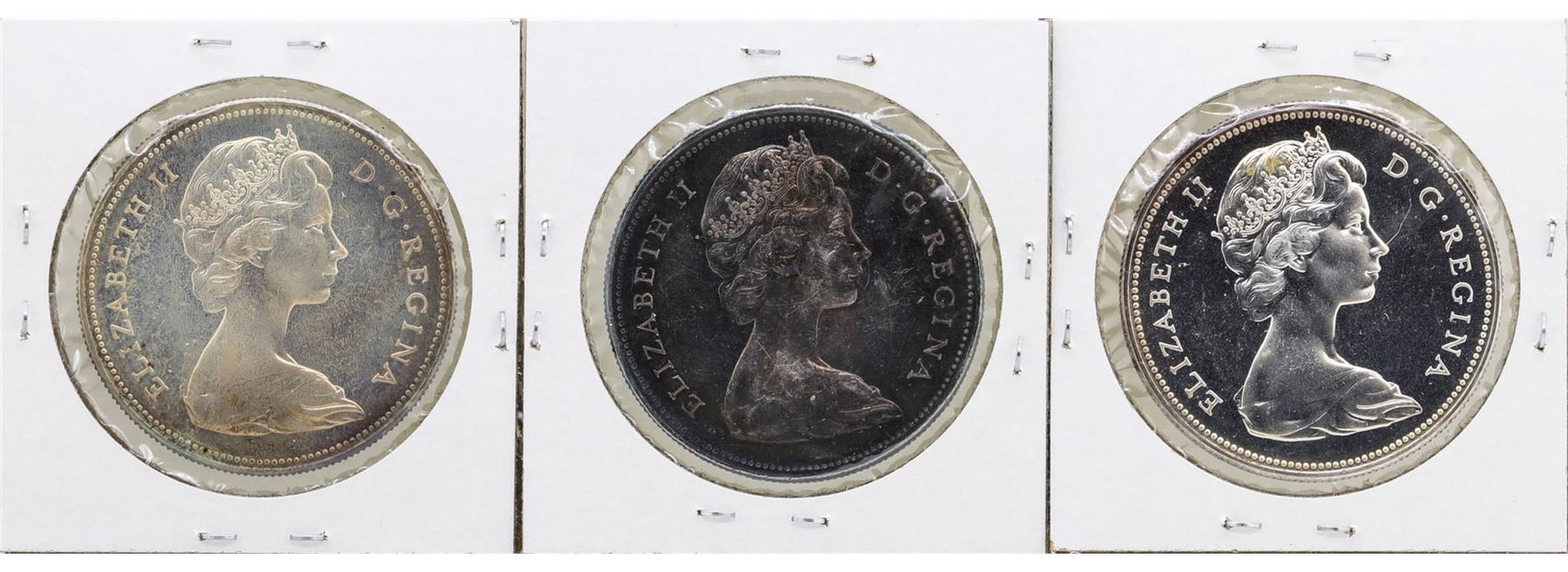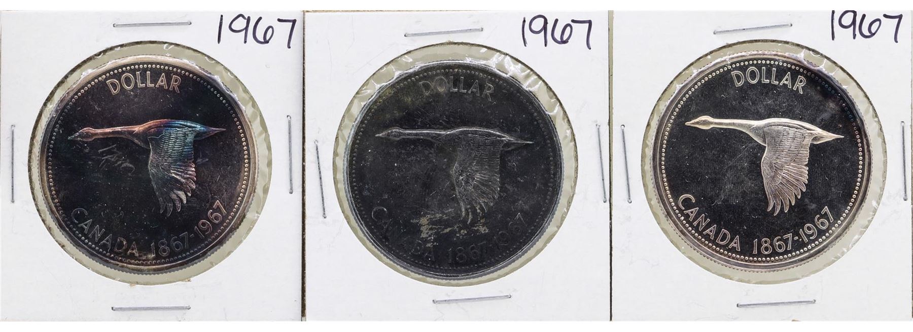 One Lot of (3) 1967 $1 Canada Silver Dollar Coins Amazing Toning.