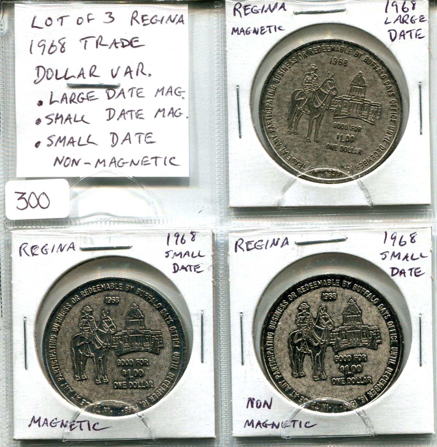 Lot of 3 1968 Regina Trade Dollar Varieties. Includes Large Date Magnetic; Small Date Magnetic; & 1968 Small Date Non-Magnetic Mule.