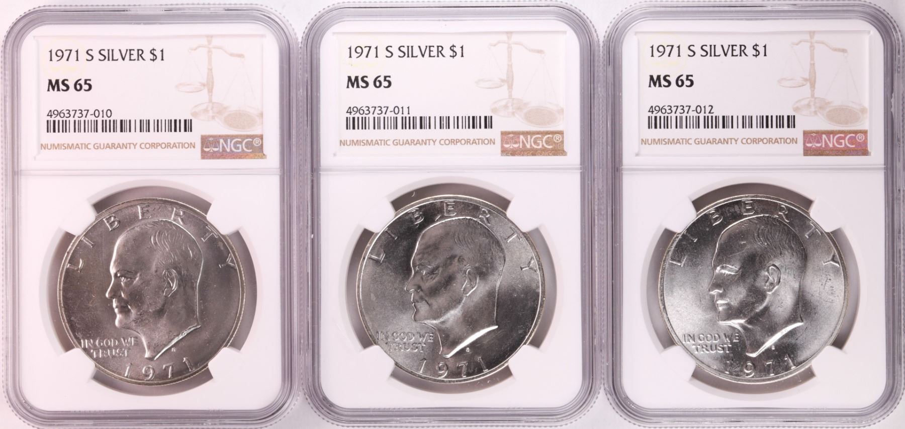 One Lot of (3) 1971-S Eisenhower Silver Dollar Coins NGC MS65.