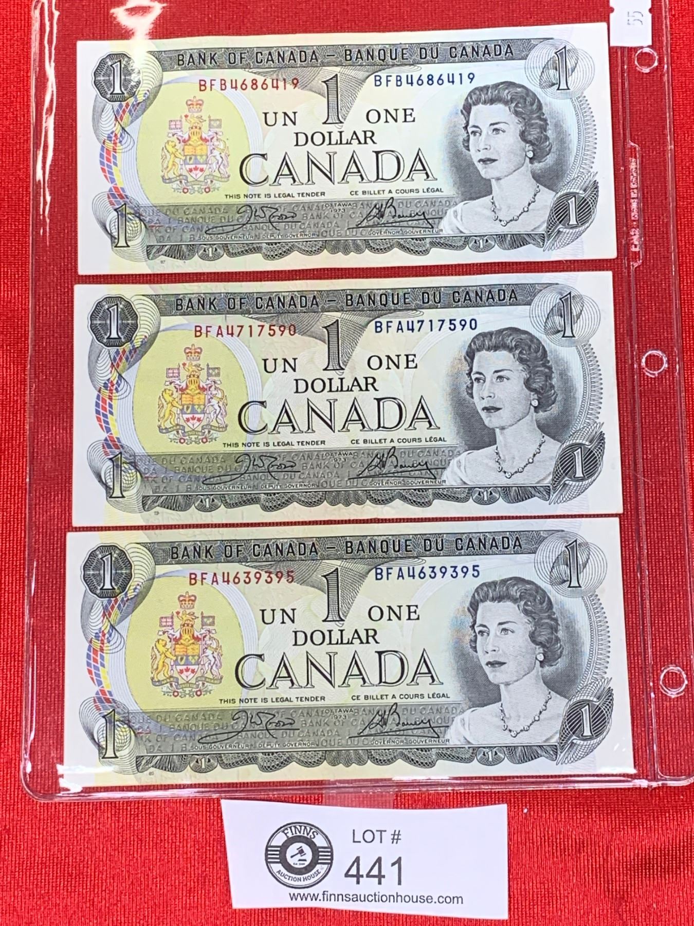Lot of 3 1973 Bank of Canada $1 Bank Notes in a Sheet Protector
