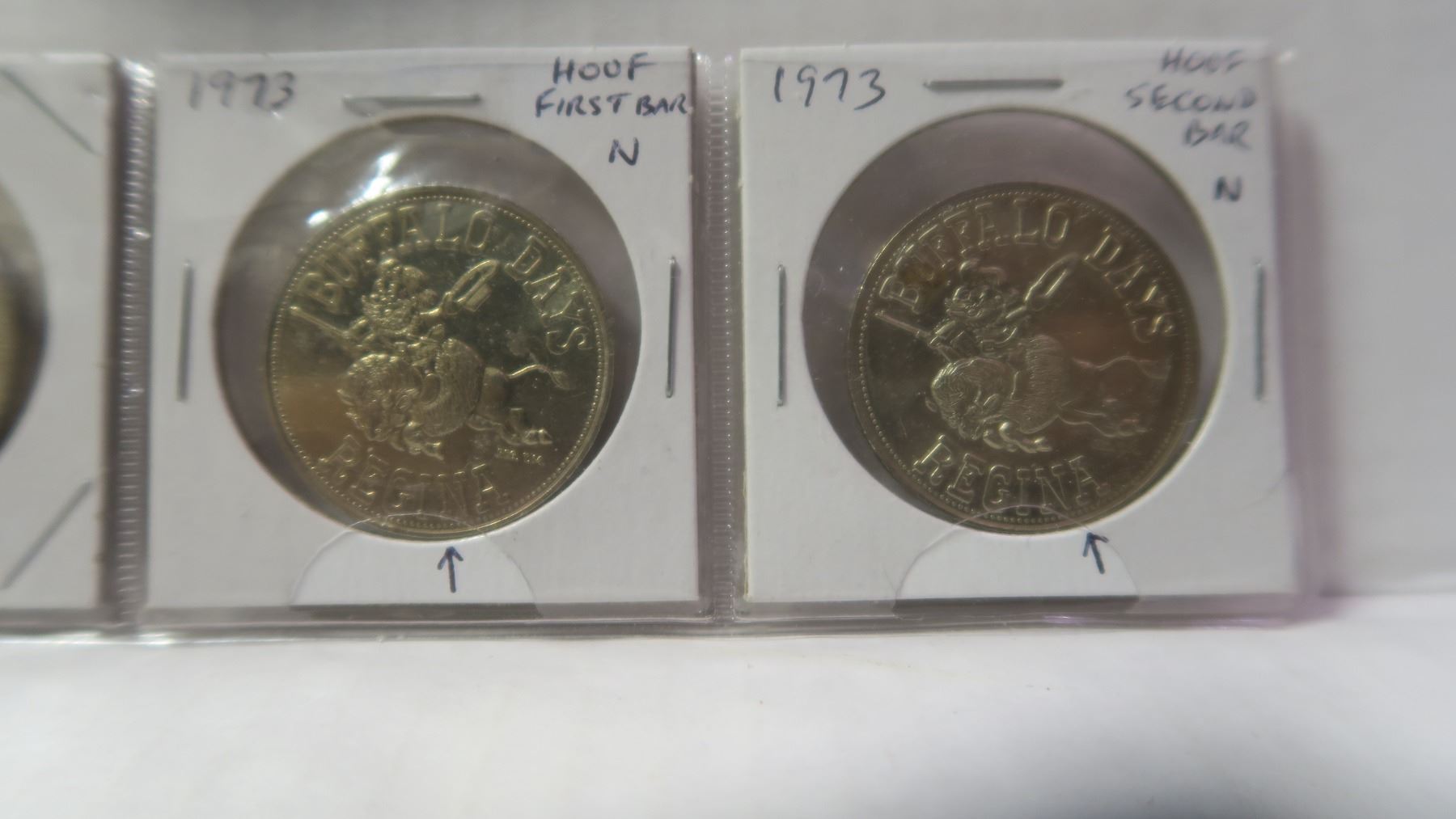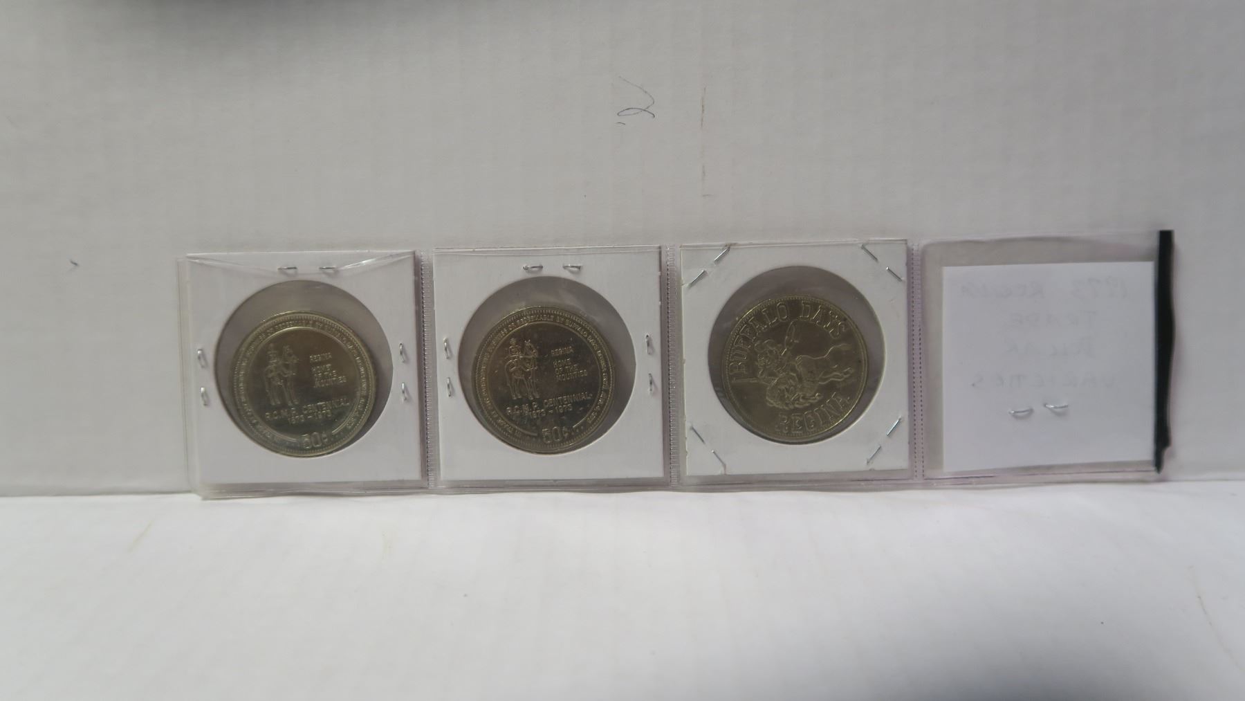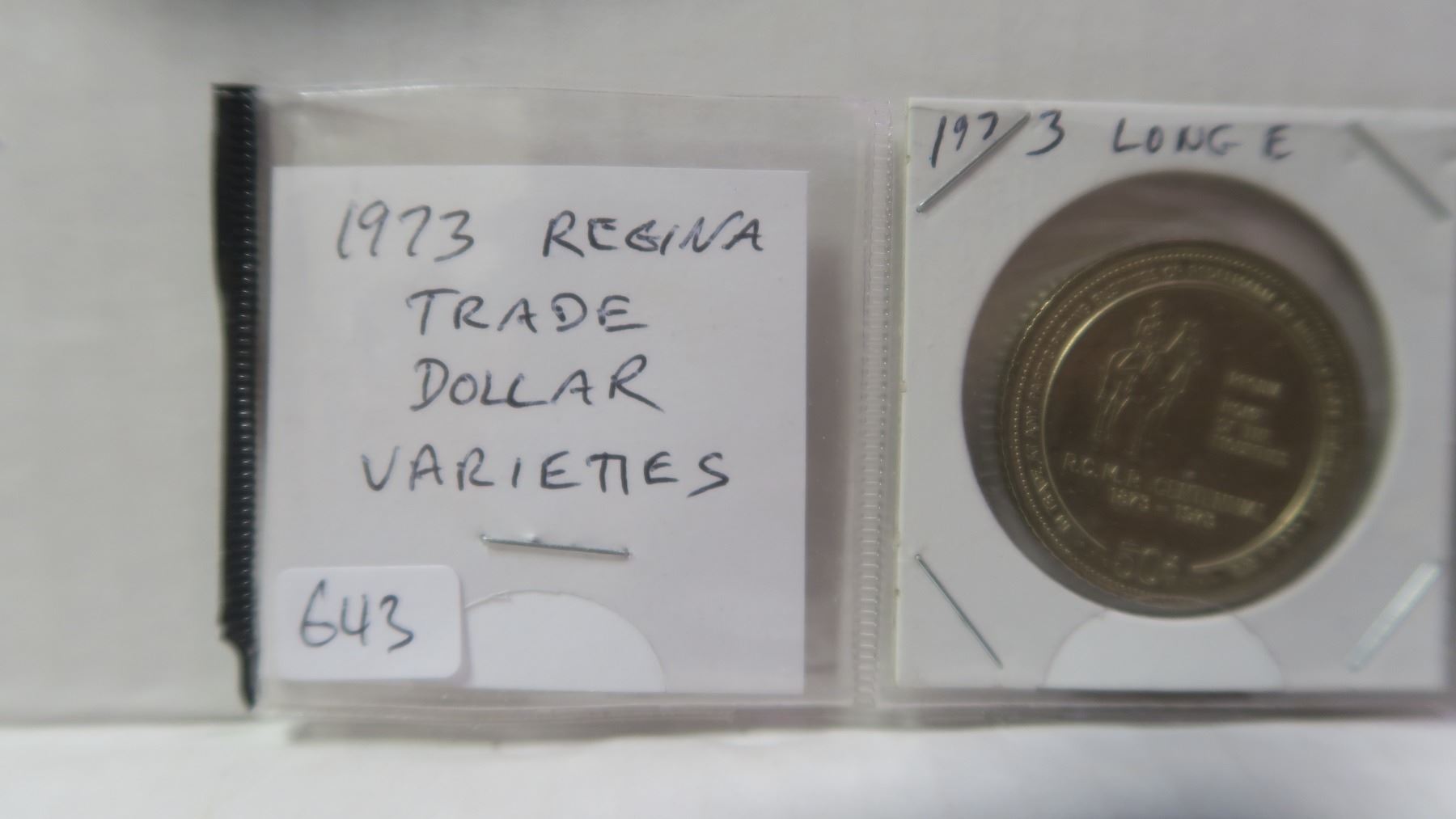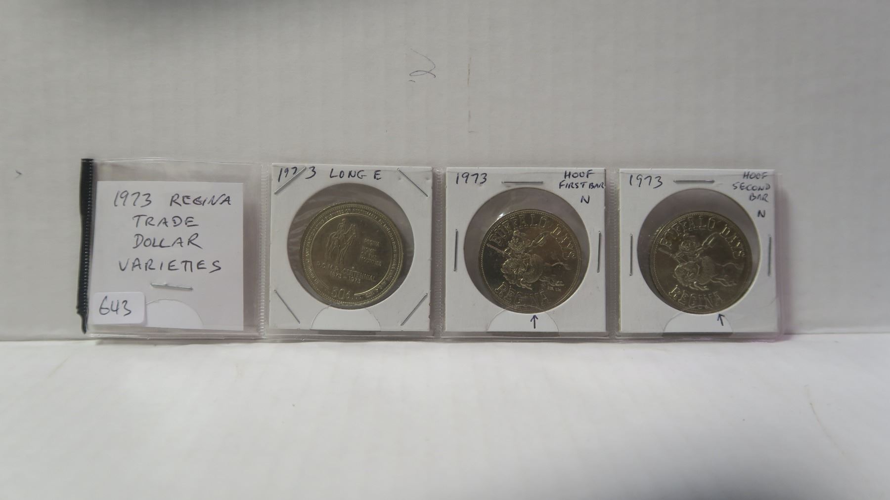 Lot of 3 1973 Regina Trade Dollar Varieties. Includes Long E in HOME, Hoof over First Bar in N & Hoof over Second Bar in N. Uncirculated.