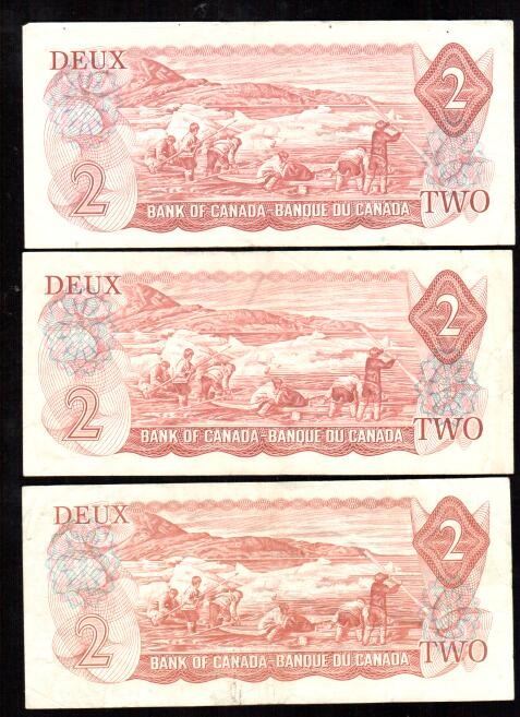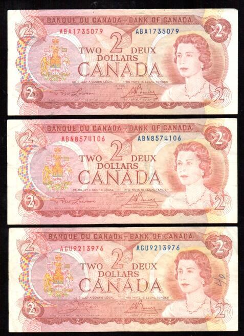 Lot 262; Lot of 3 - 1974 Canada $2 Bank of Canada Banknotes, Serial Numbers #ABN8574106 Lawson-Bouey, #ABA1735079 Lawson-Bouey, #AGU9213976 Crow-Bouey