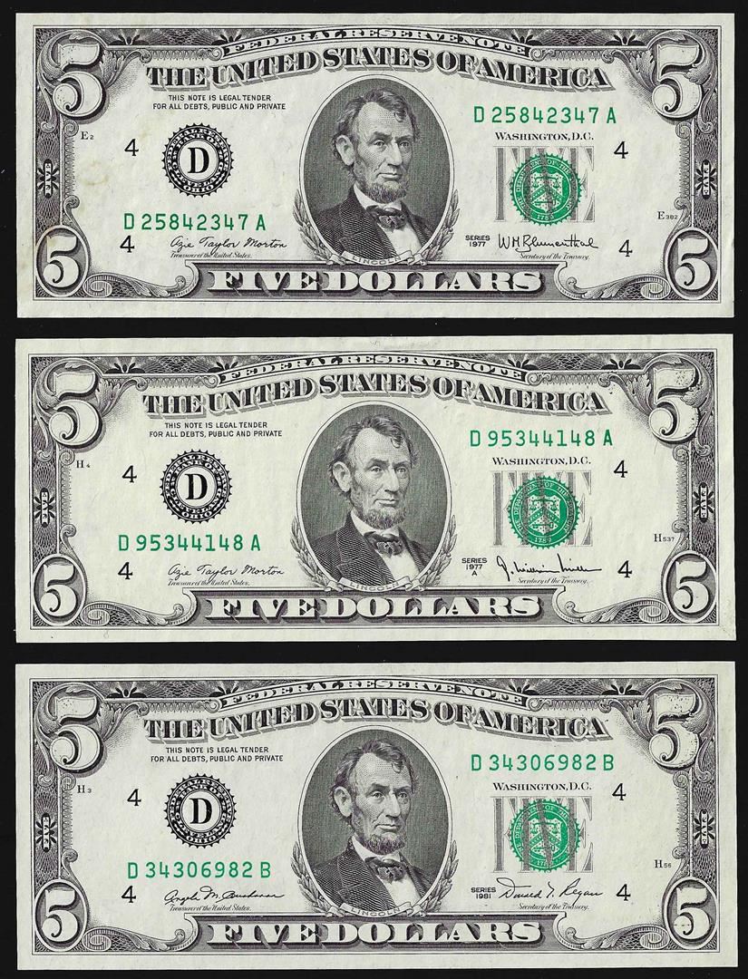 One Lot of (3) 1977 & 1981 $5 Federal Reserve Notes Choice Uncirculated.