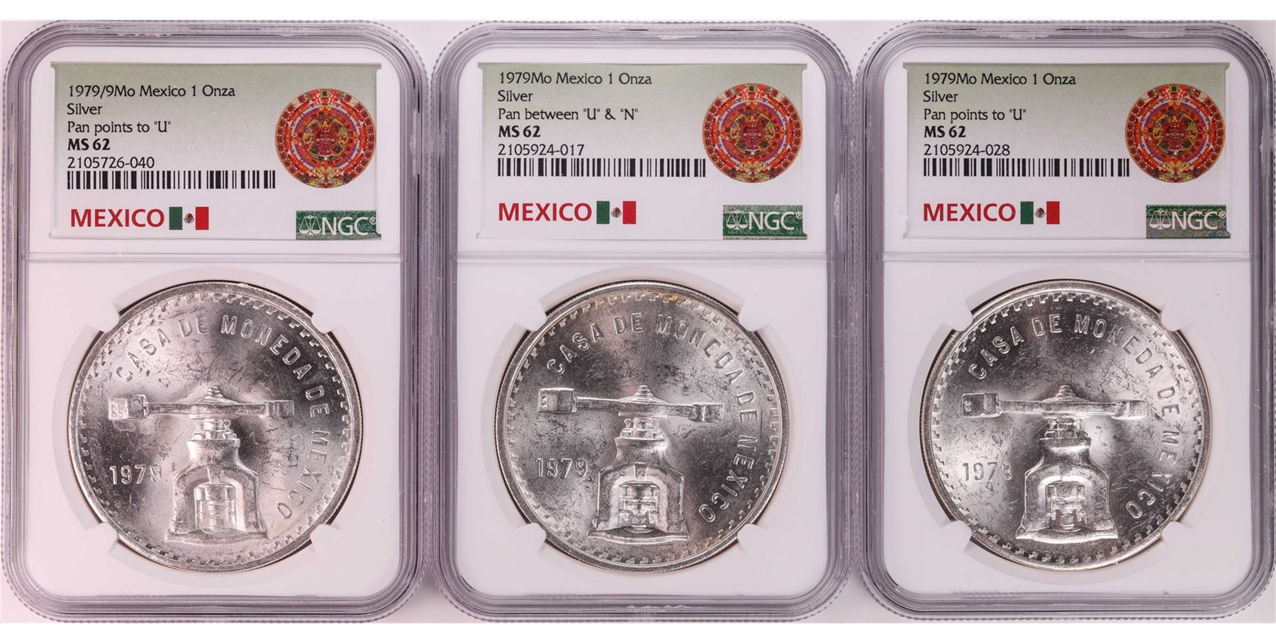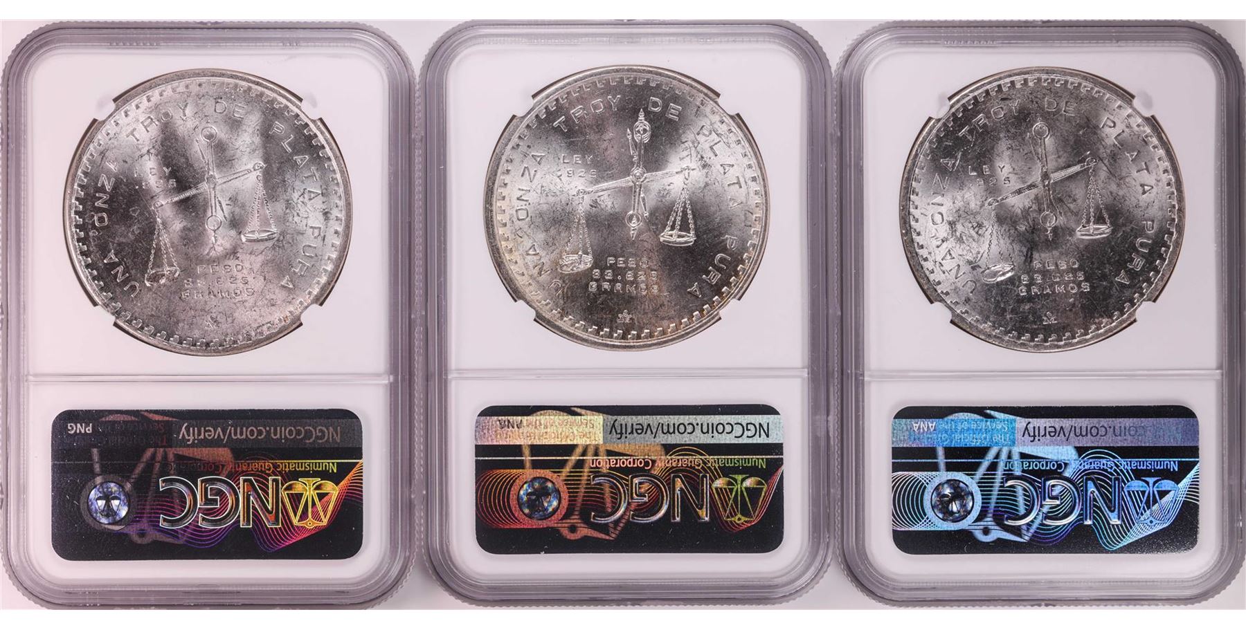 One Lot of (3) 1979Mo Mexico 1 Onza Silver Coins NGC MS62. NGC Certified.