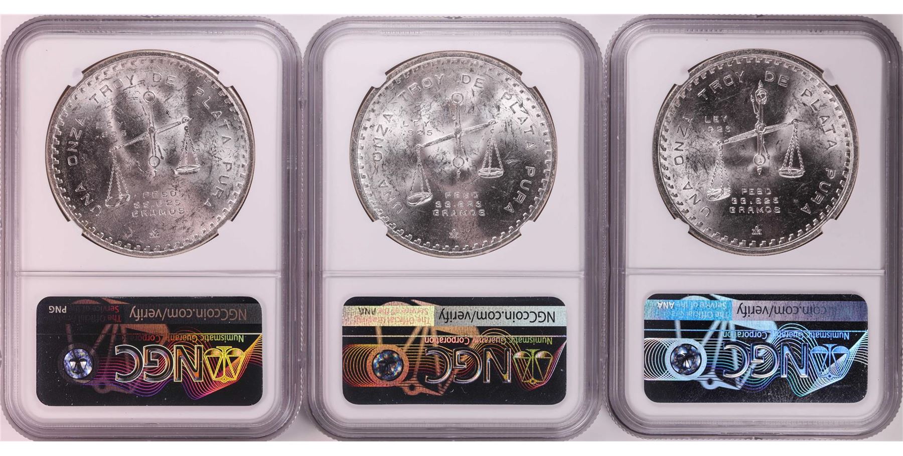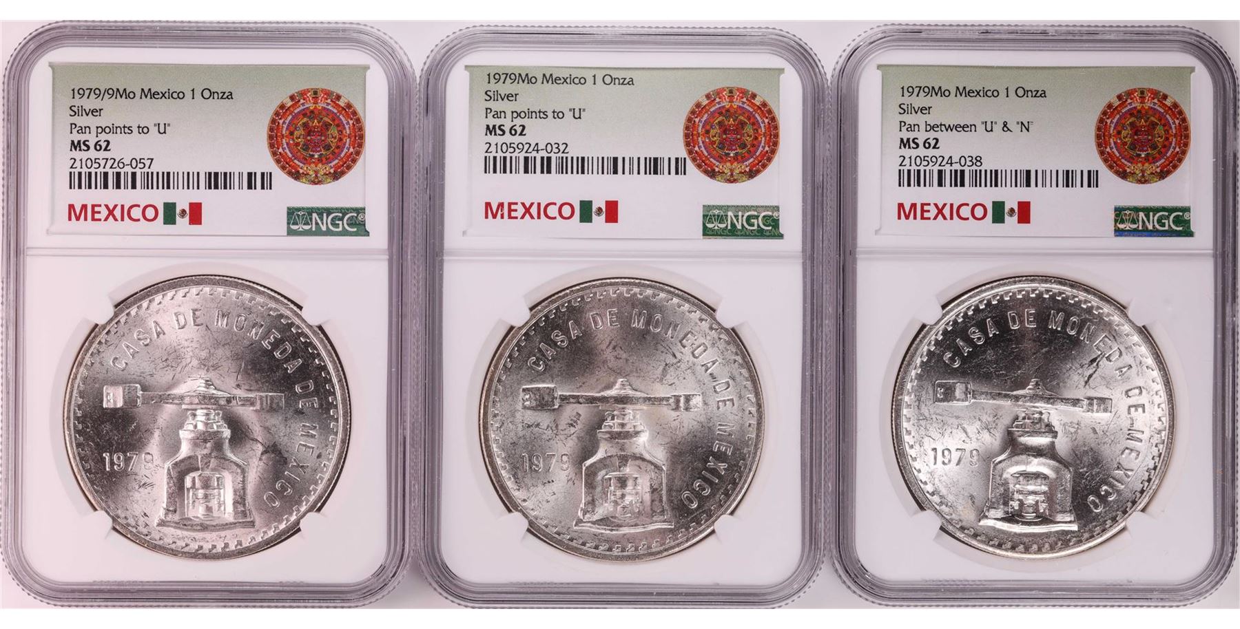 One Lot of (3) 1979Mo Mexico 1 Onza Silver Coins NGC MS62. NGC Certified.
