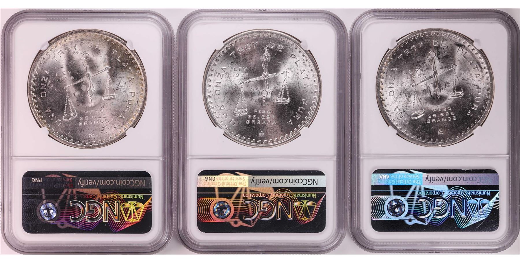 One Lot of (3) 1979Mo Mexico 1 Onza Silver Coins NGC MS62. NGC Certified.