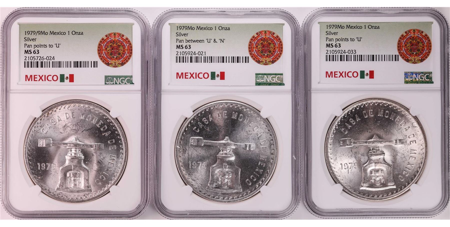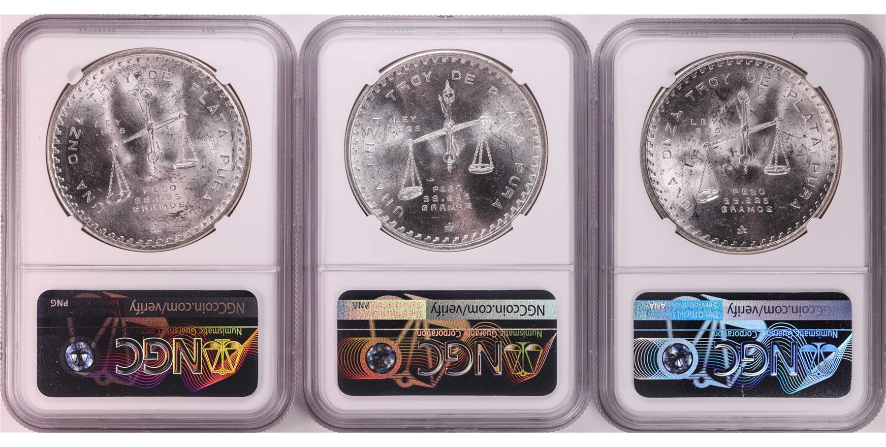 One Lot of (3) 1979Mo Mexico 1 Onza Silver Coins NGC MS63. NGC Certified.