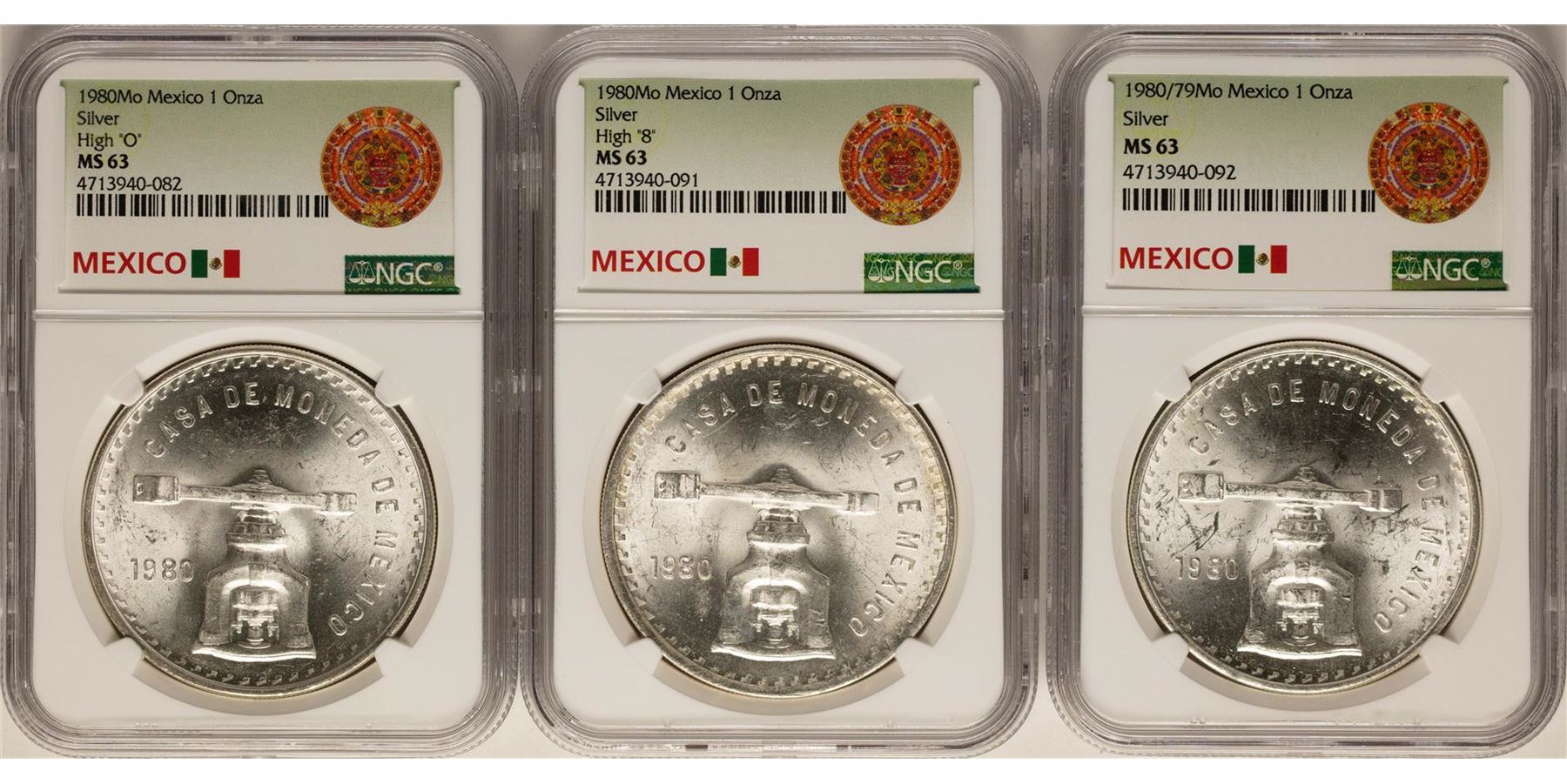 One Lot of (3) 1980Mo Mexico 1 Onza Silver Coins NGC MS63. NGC Certified.