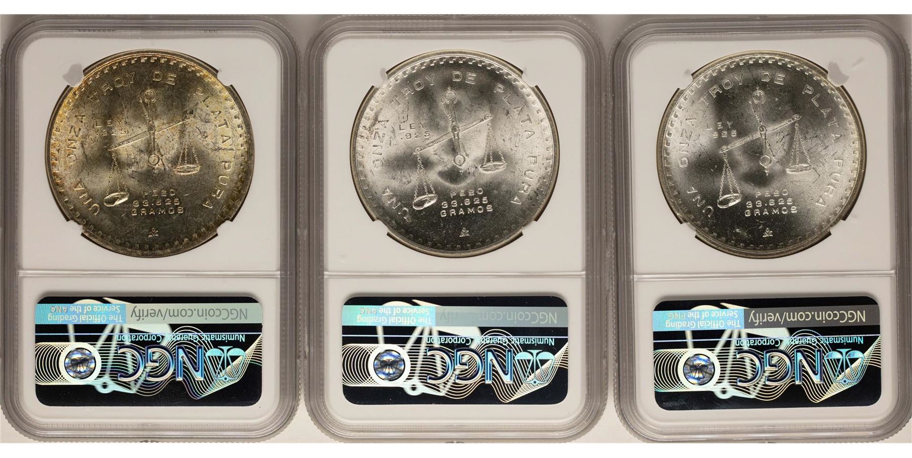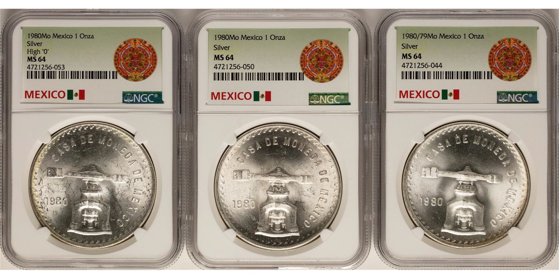 One Lot of (3) 1980Mo Mexico 1 Onza Silver Coins NGC MS64. NGC Certified.