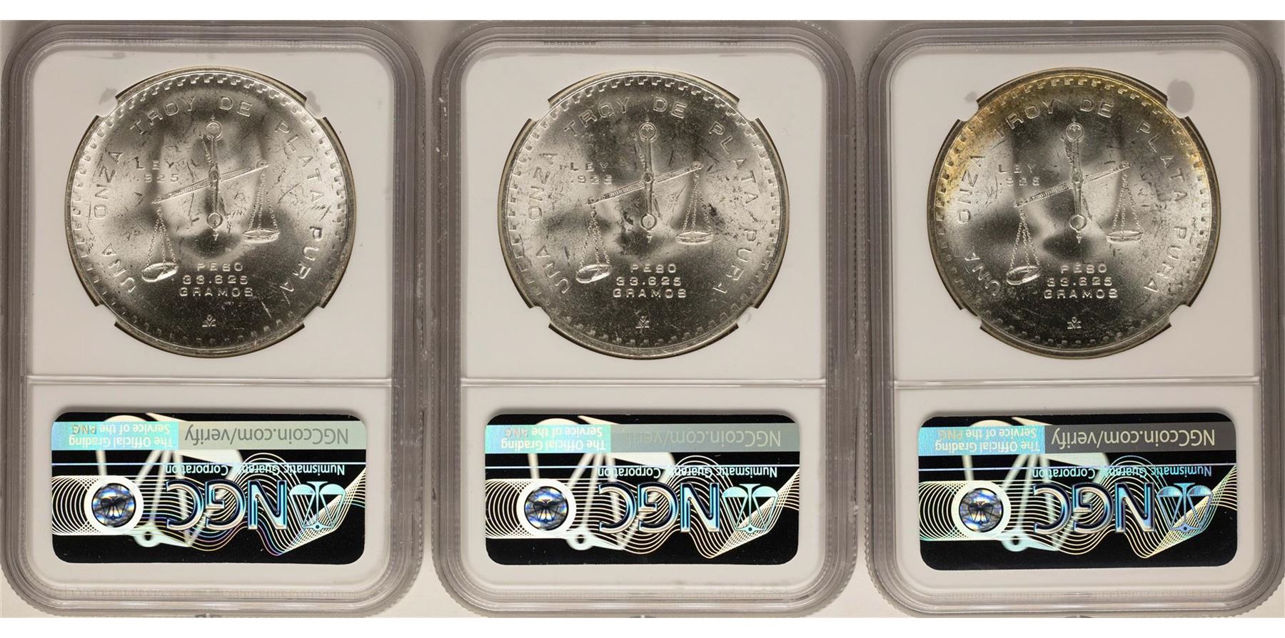 One Lot of (3) 1980Mo Mexico 1 Onza Silver Coins NGC MS64. NGC Certified.