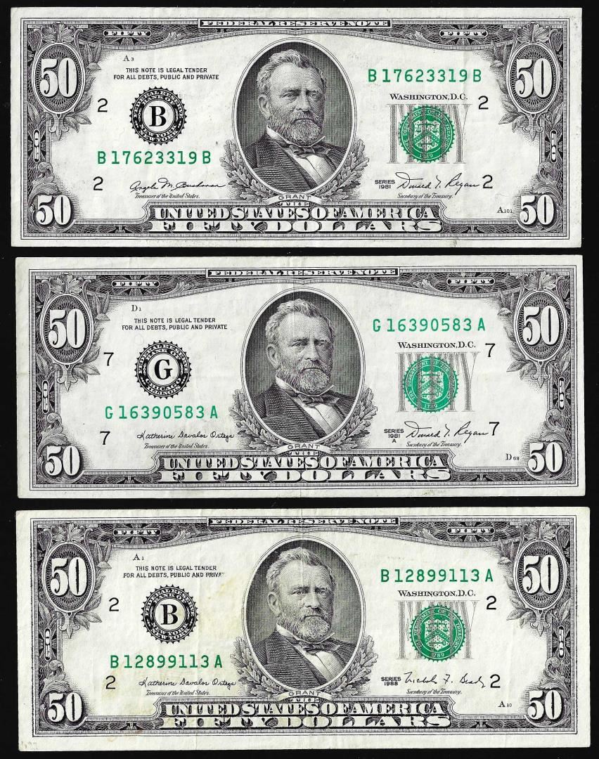 One Lot of (3) 1981 & 1985 $50 Federal Reserve Notes.