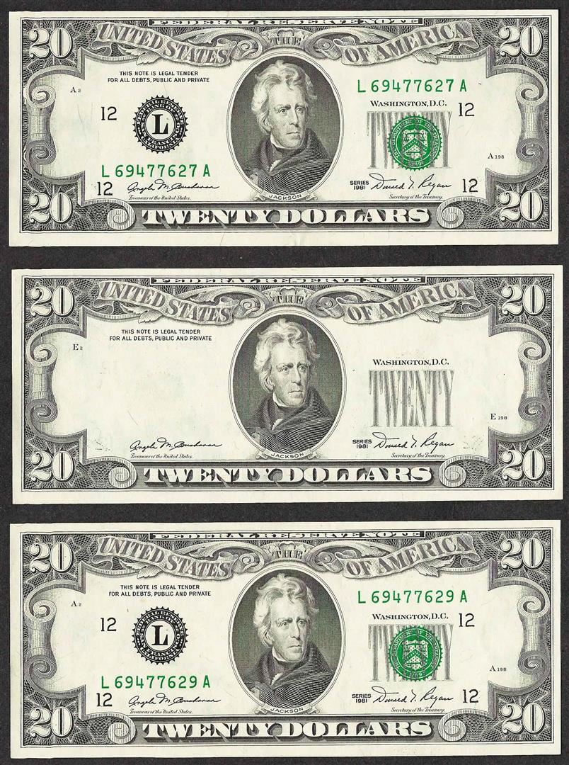 Lot of (3) 1981 $20 Federal Reserve Notes Book End ERROR 3rd Print on Reverse