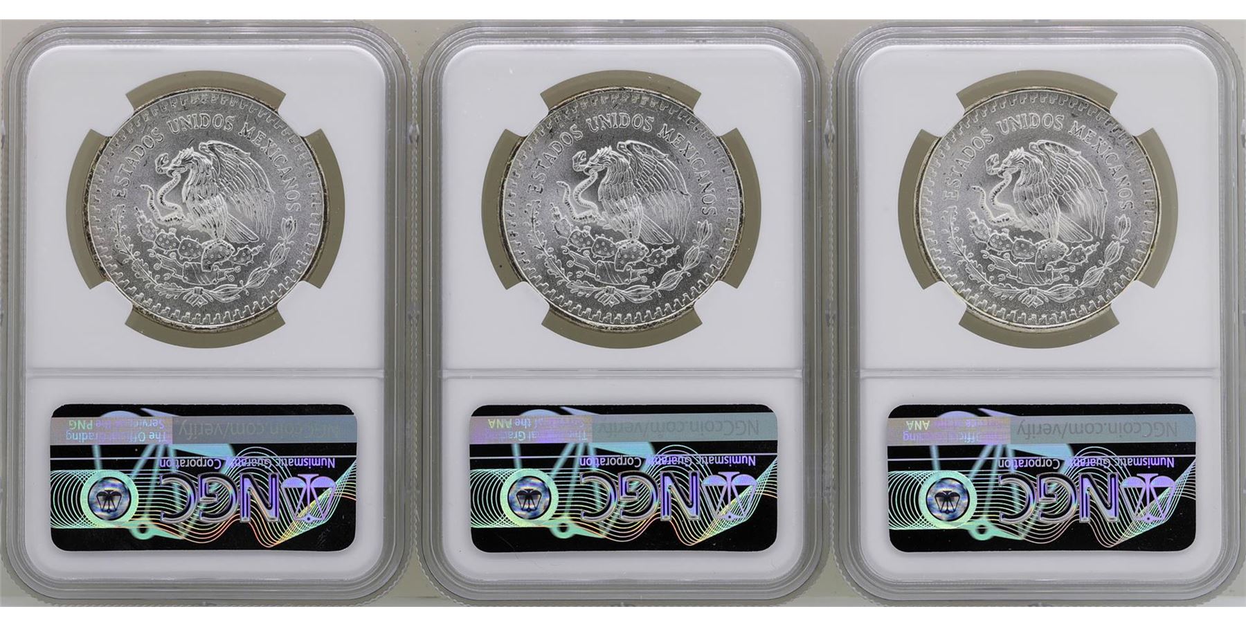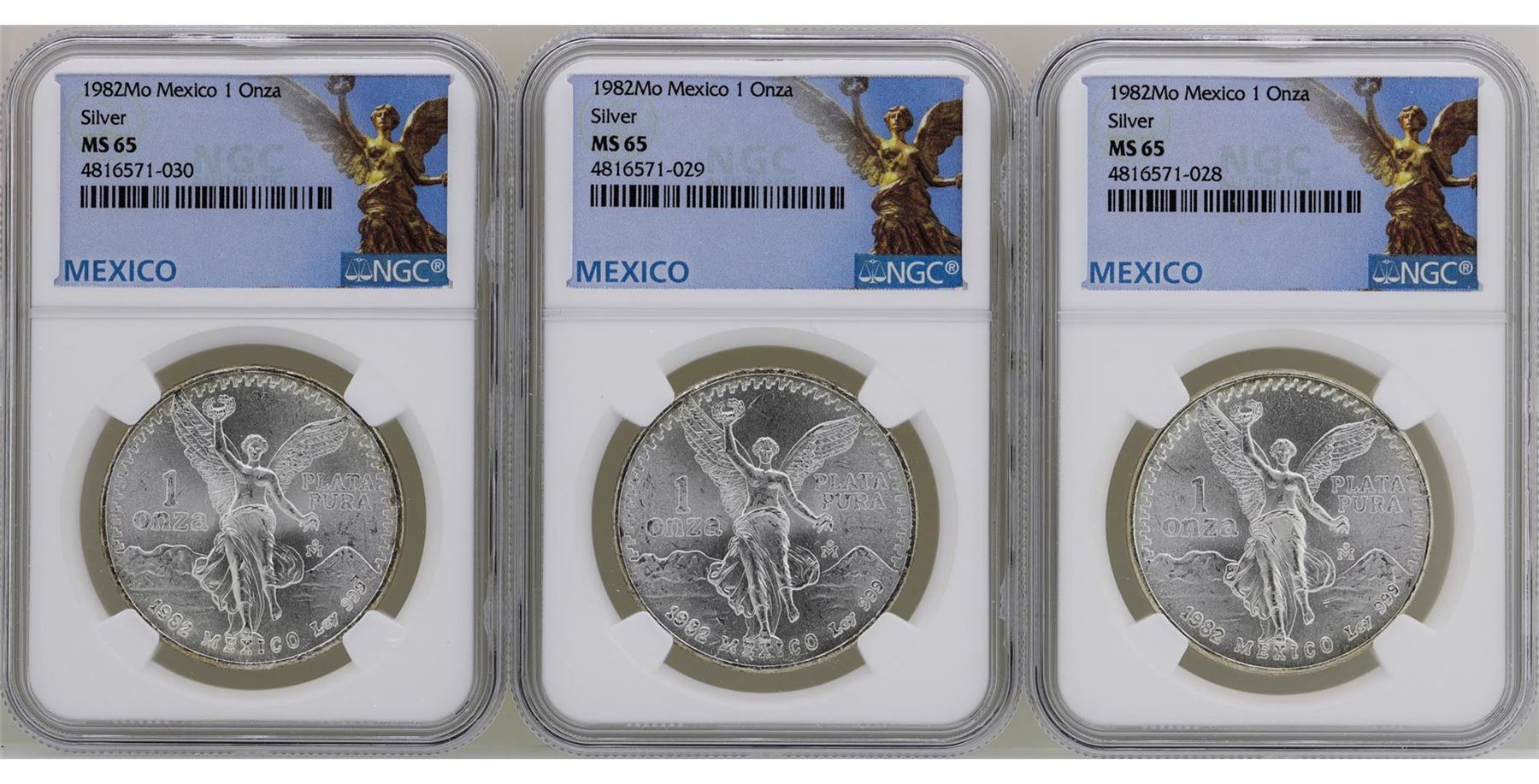 One Lot of (3) 1982Mo Mexico Libertad Onza Silver Coins NGC MS65. NGC Certified.