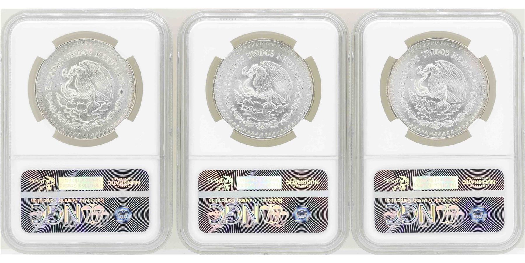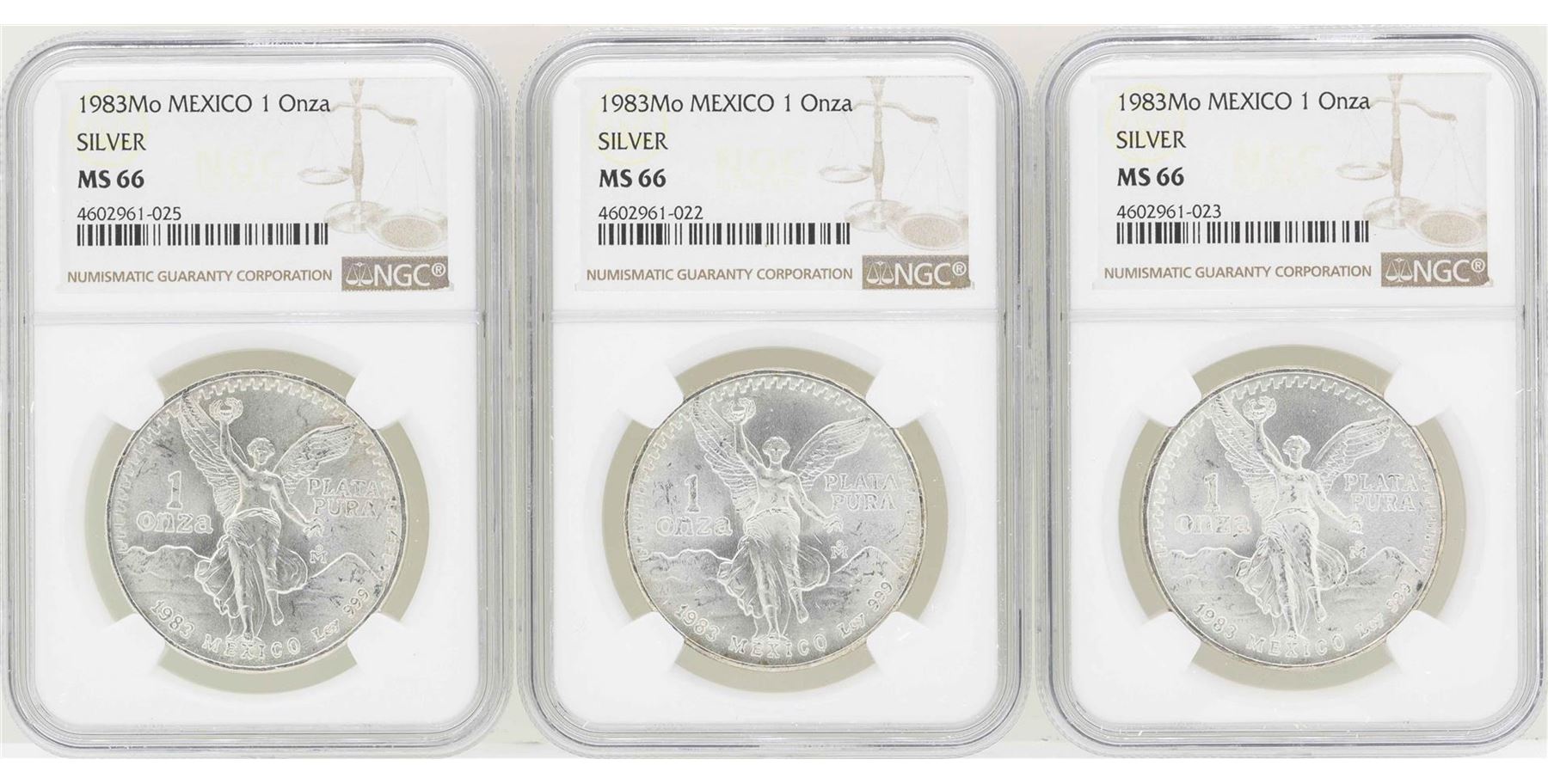 One Lot of (3) 1983Mo 1 Onza Silver Libertad Coins NGC MS66. NGC Certified.