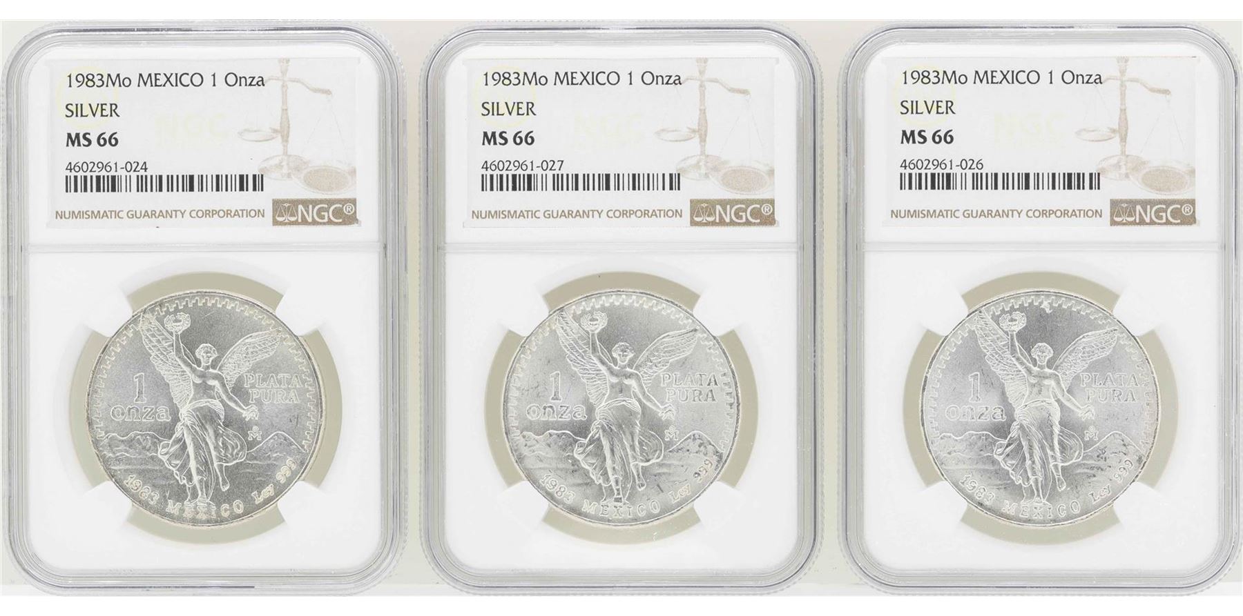 One Lot of (3) 1983Mo 1 Onza Silver Libertad Coins NGC MS66. NGC Certified.