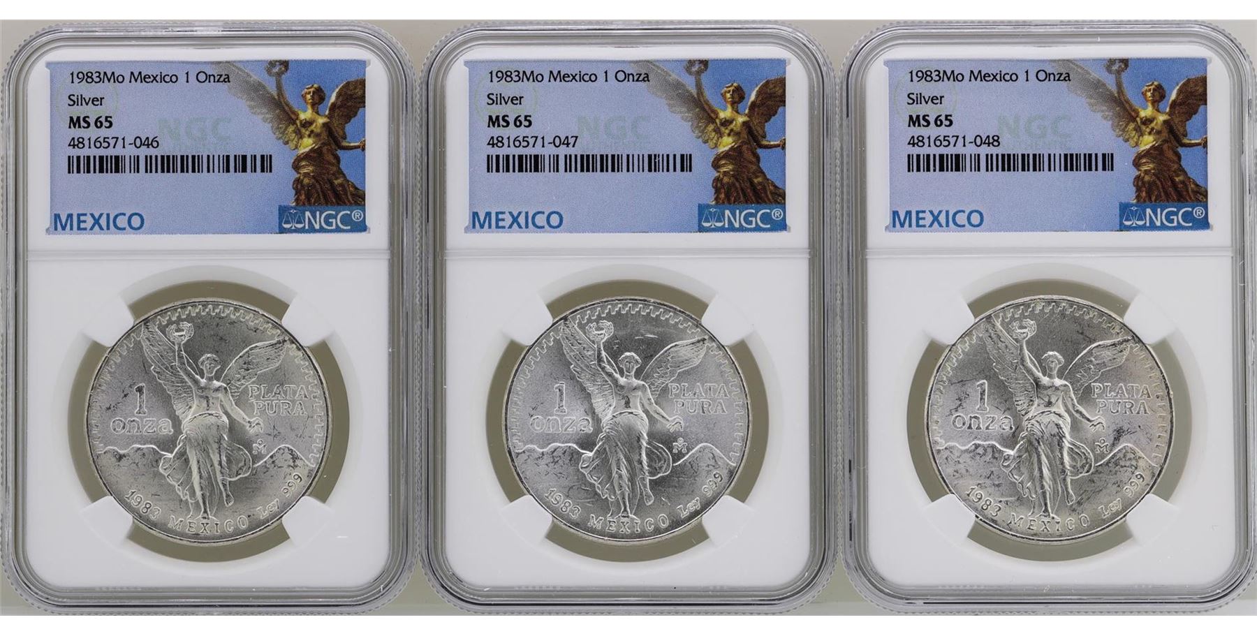 One Lot of (3) 1983Mo Mexico Libertad Onza Silver Coins NGC MS65. NGC Certified.