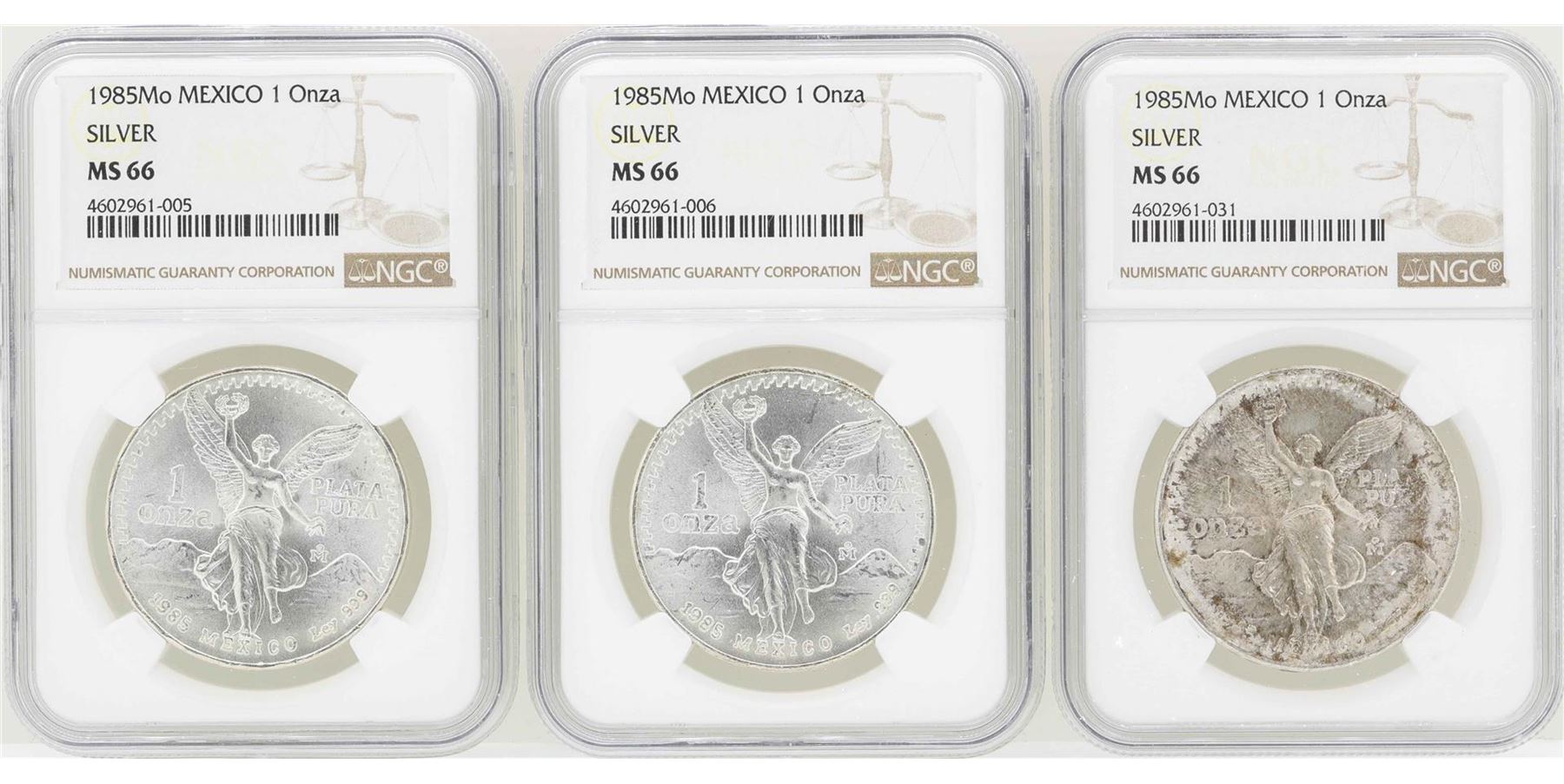 One Lot of (3) 1985Mo 1 Onza Silver Libertad Coins NGC MS66. NGC Certified.