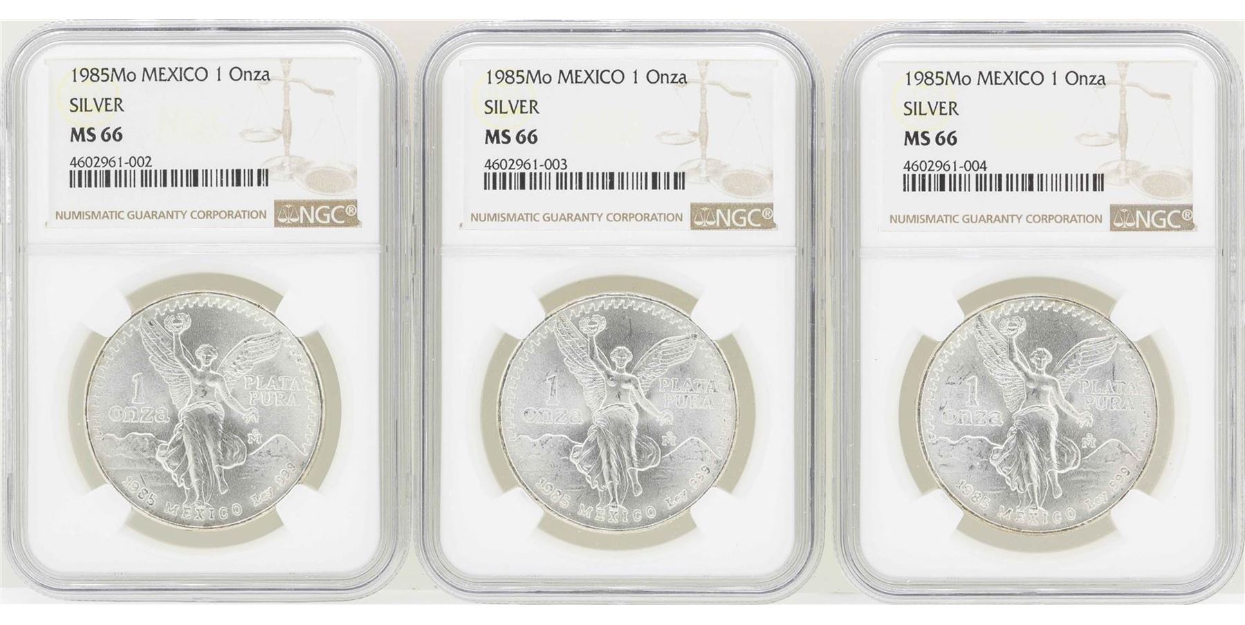 One Lot of (3) 1985Mo 1 Onza Silver Libertad Coins NGC MS66. NGC Certified.