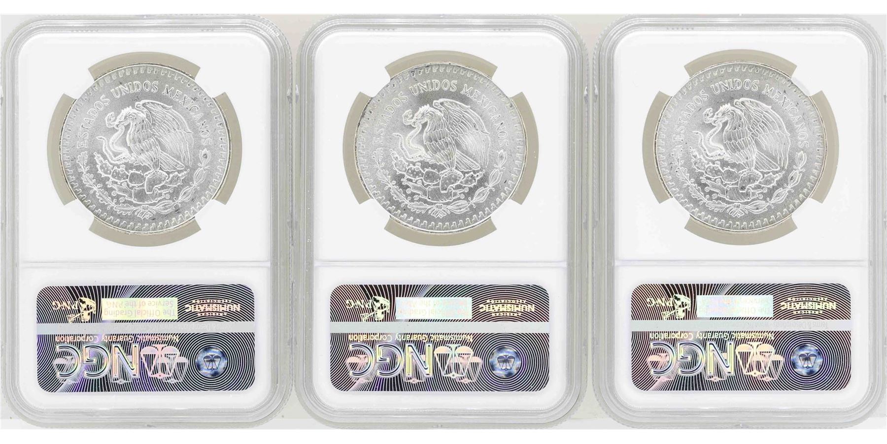 One Lot of (3) 1985Mo 1 Onza Silver Libertad Coins NGC MS66. NGC Certified.