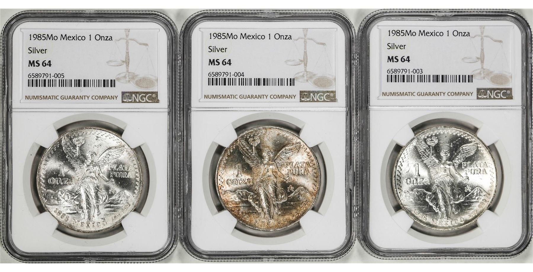 Lot of (3) 1985Mo Mexico 1 Onza Libertad Silver Coins NGC MS64